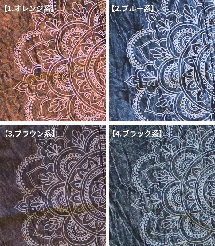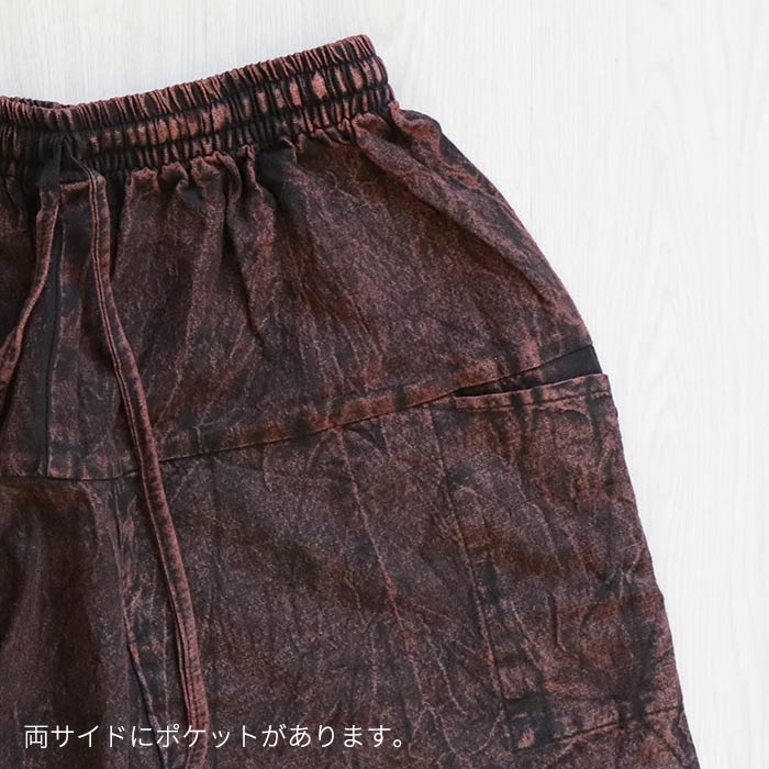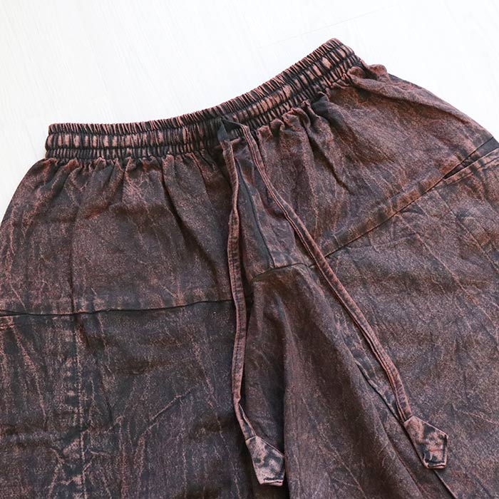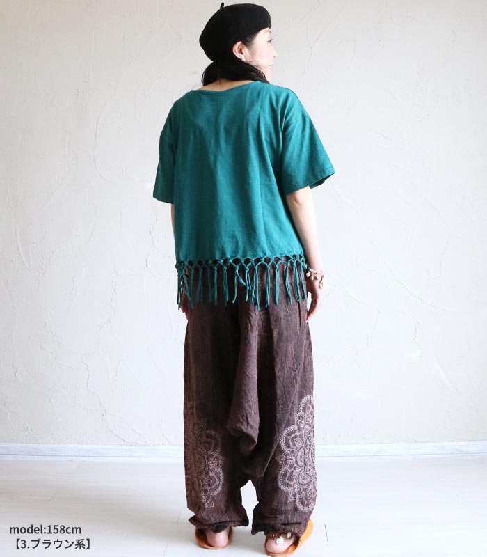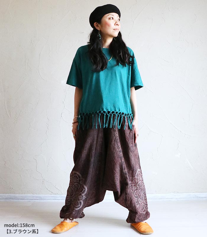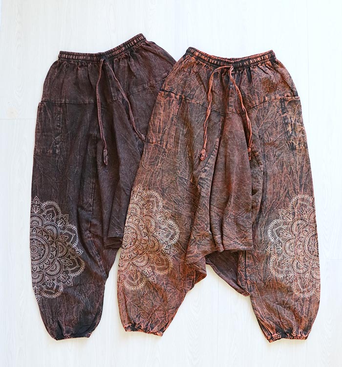 コメント: 渋めのウォッシュカラーがお洒落な、曼荼羅風デザインサルエルパンツ。生地にシルクスクリーンプリントを施しパンツの形に縫製、それからストーンウォッシュ加工と、デザイン・工程・仕上がりにこだわり制作されたパンツです。穿くだけでこなれ感の出るシルエットは、大人エスニックにピッタリのボトムス。ウエストにはゴム・ヒモ、裾にゴム入りで動きやすく、アクティブなシーンやリラックスタイムにもぴったりの穿き心地。ダークなウォッシュカラー、ゆったりとしたシルエットでユニセックスに着用して頂けます。