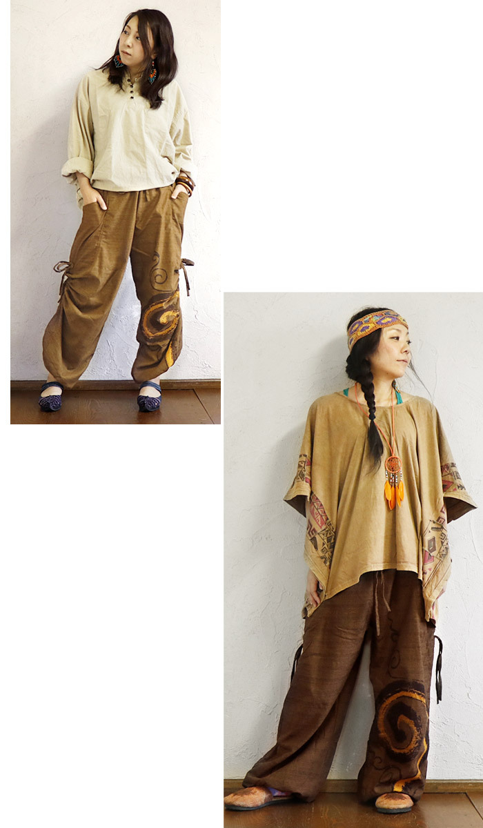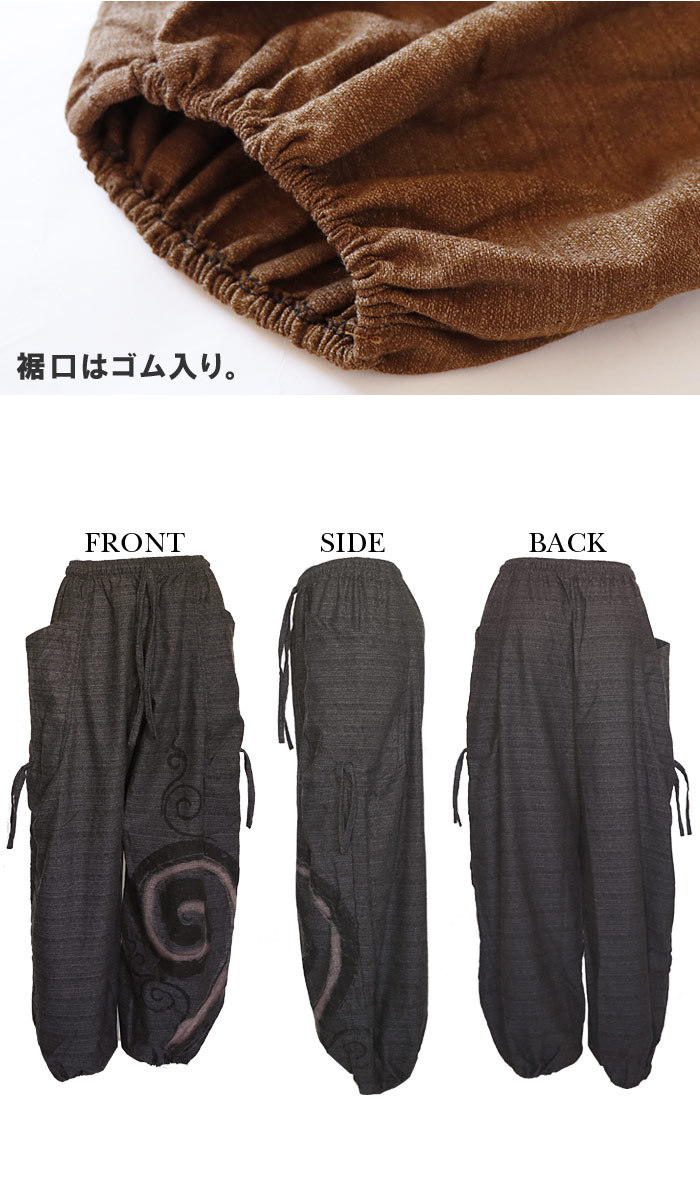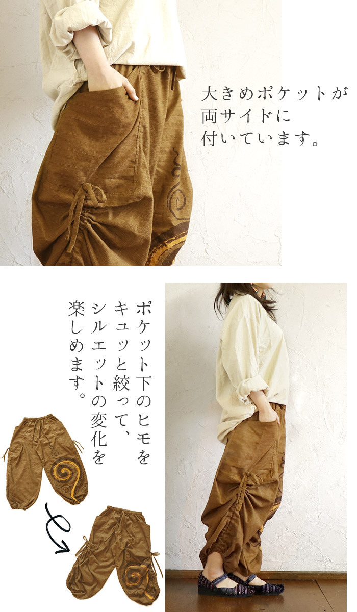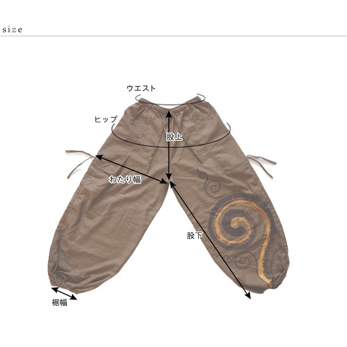 | 【staff】フジヤマ 162cm/普段:L/がっしり体型 ウエストのくびれ部分の位置で穿いて、丈はくるぶし上くらい。ウエスト・裾のゴムは窮屈感がなく、ゆったり穿けました。薄手ですが、中にレギンスも穿けるサイズ感なので、長いシーズン着ていただけます。片足だけに入ったぐるぐる模様がカッコ良く、メンズっぽい着こなしがオススメです◎ |