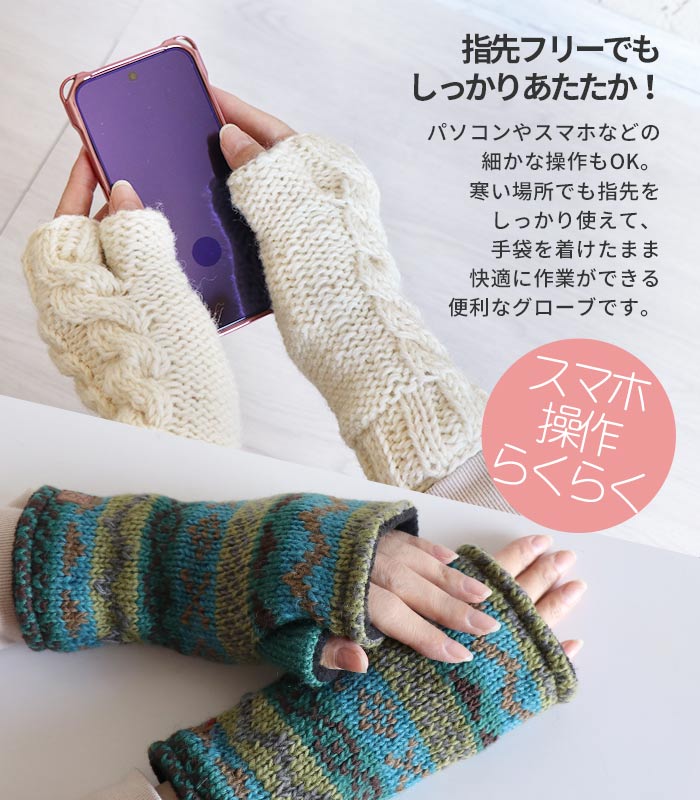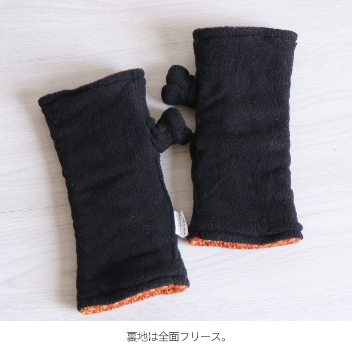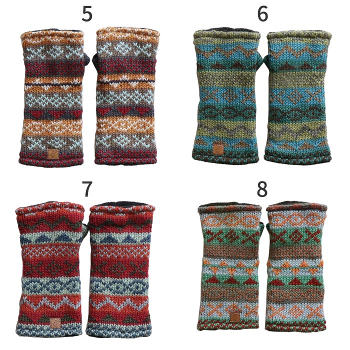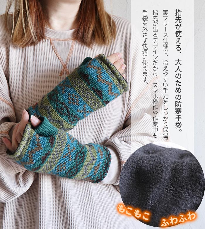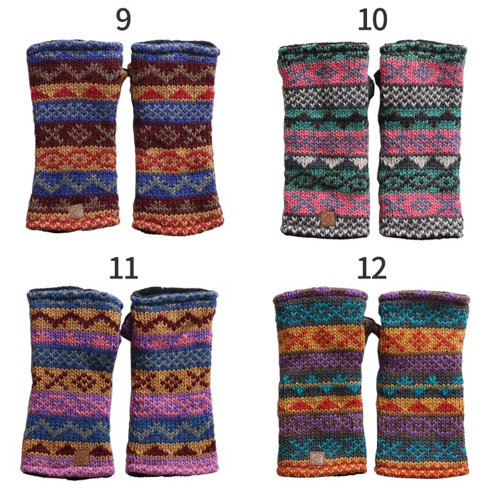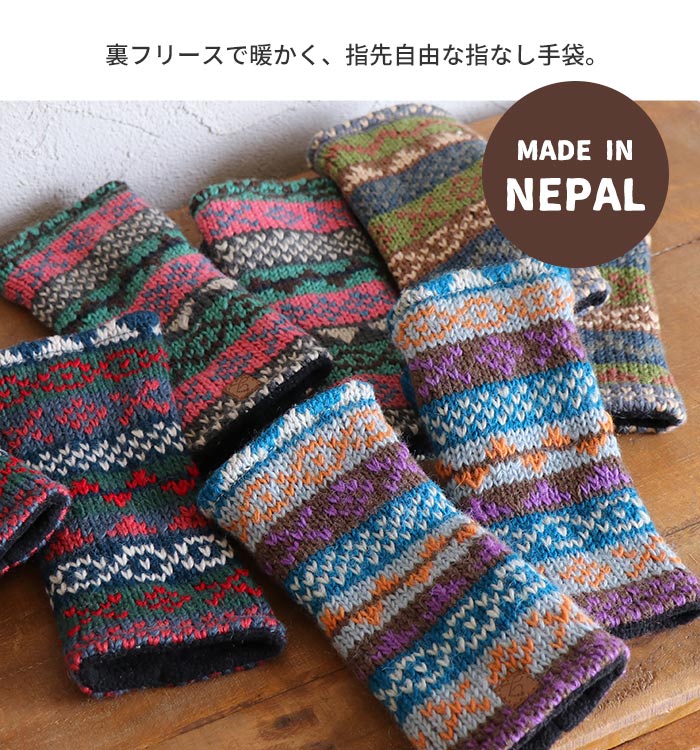 コメント: ネパールから届いた、温もりを感じるエスニック柄のフィンガーレス手袋。表地はウール素材を使用し、内側にはふわふわとしたフリースを施した二重構造。冷えやすい冬の手元を、やさしく包み込みます。指先が出るデザインなので、スマホ操作や細かな作業もしやすく、日常使いはもちろんアウトドアシーンにも活躍。程よい厚みがありながらもごわつかず、長時間の着用でも快適です。カラフルで温かみのある柄は、シンプルなコーデのアクセントにも◎。メンズ・レディース問わず使えるデザインで、冬のギフトにもおすすめのアイテムです。