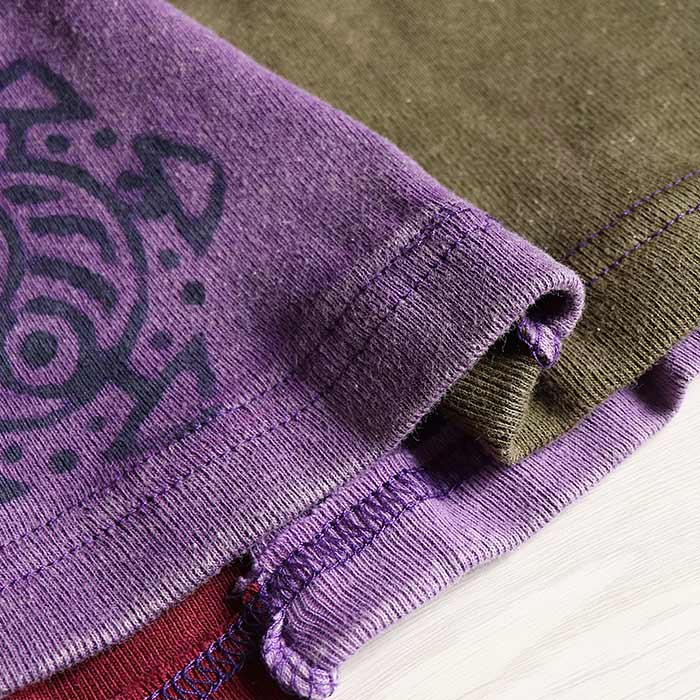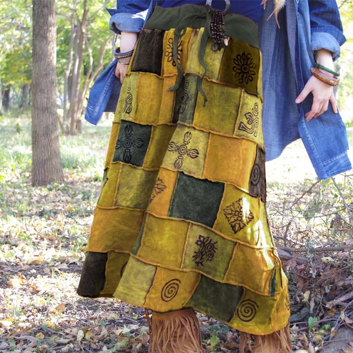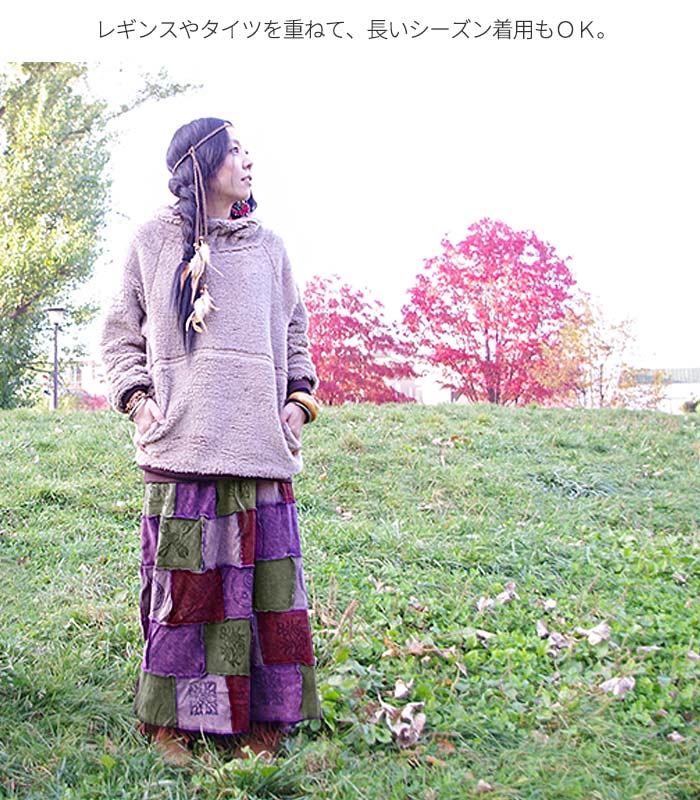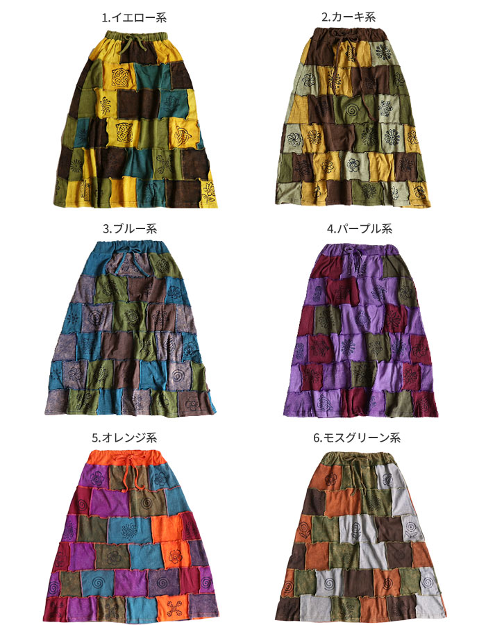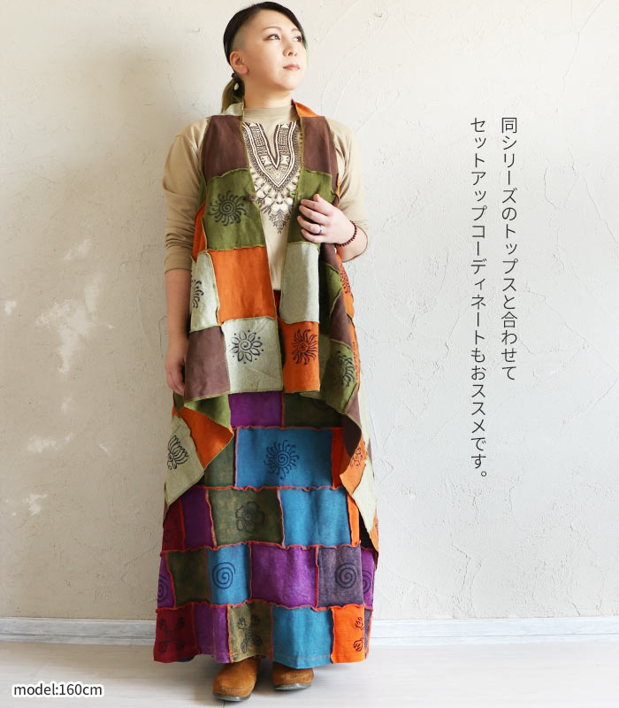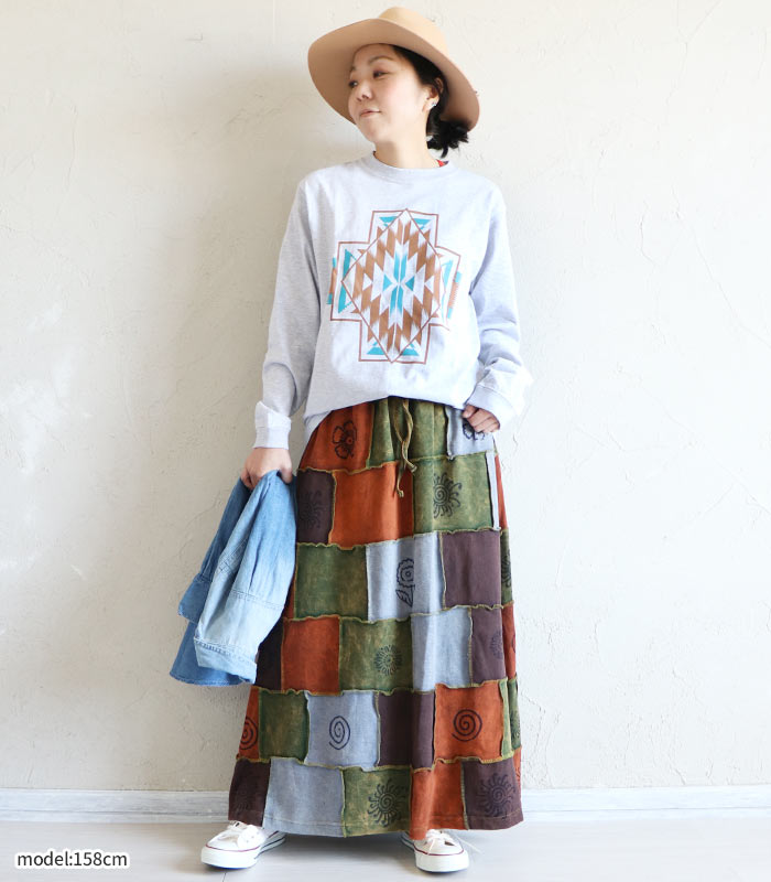 コメント: ストーンウォッシュを効かせてヴィンテージ感を楽しめる、ダークカラーのパッチワークロングスカート。パッチワーク生地には模様のひとつひとつに意味がある、チベットの伝統的な模様をプリント。古来より伝わる模様がランダムに入ってレトロな雰囲気に。ゆったり着られるのにスッキリ見える、広がりすぎない台形シルエット。ウエストはゴム&ヒモ仕様で、楽に穿けるのも嬉しいポイント。色や模様の出方によって表情が異なり、自分だけの特別感を感じられるアイテムです。
