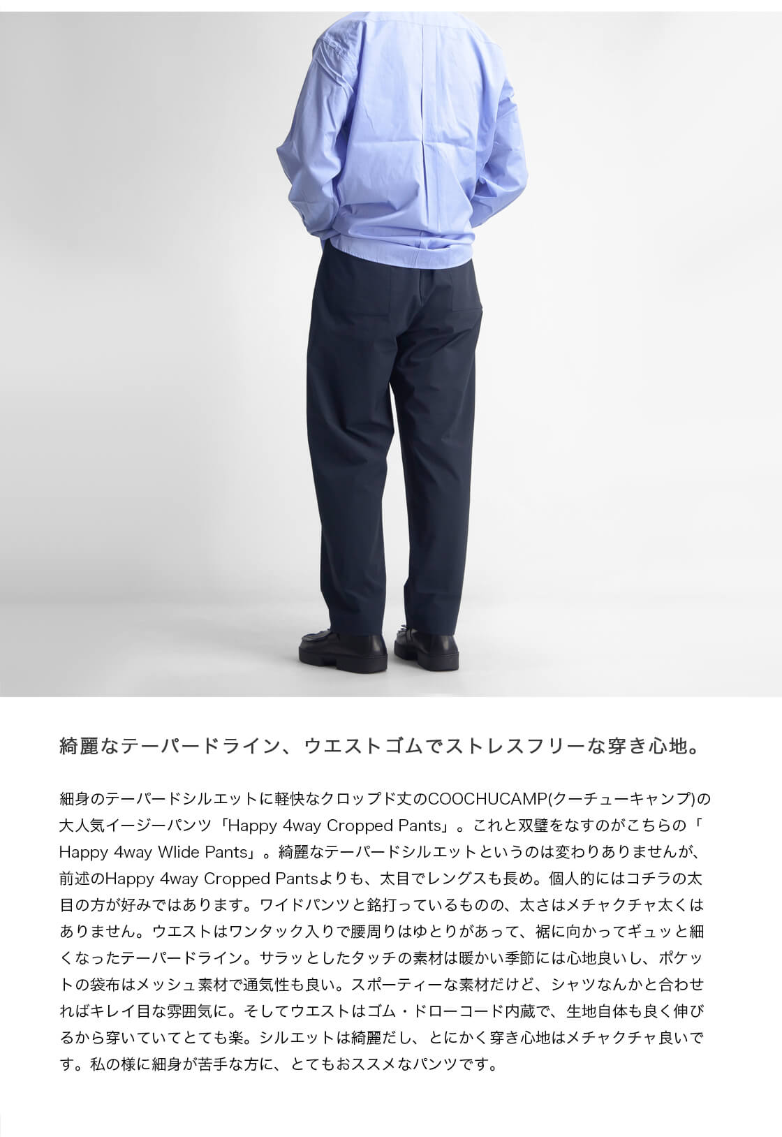細身のテーパードシルエットに軽快なクロップド丈のCOOCHUCAMP(クーチューキャンプ)の大人気イージーパンツ「Happy 4way Cropped Pants」。