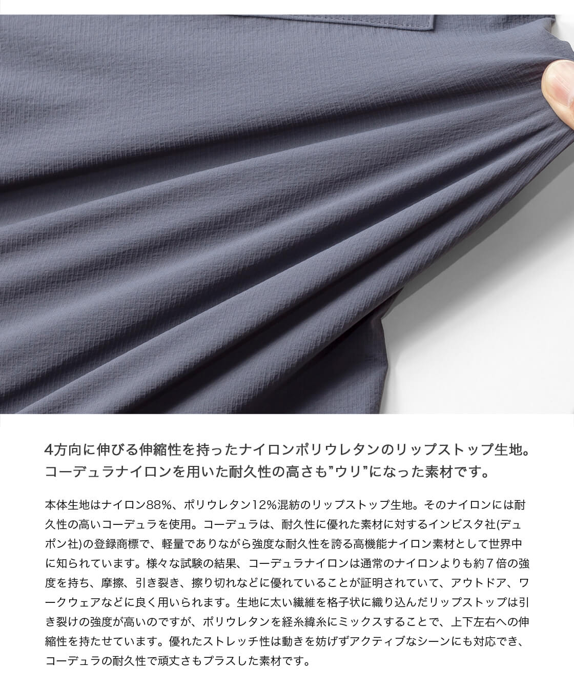 優れたストレッチ性は動きを妨げずアクティブなシーンにも対応でき、コーデュラの耐久性で頑丈さもプラスした素材です。