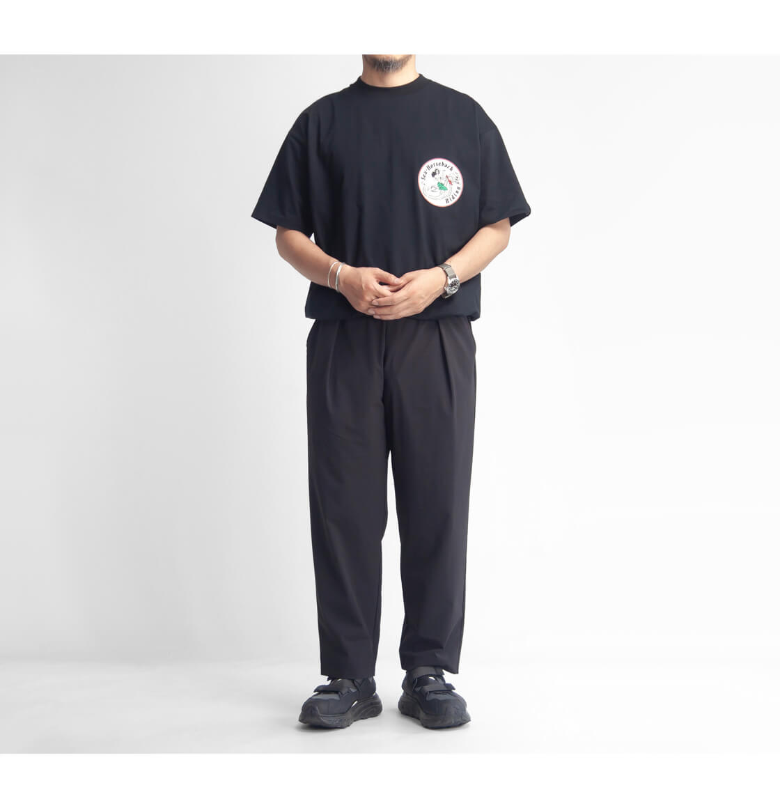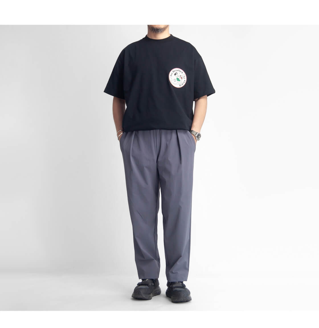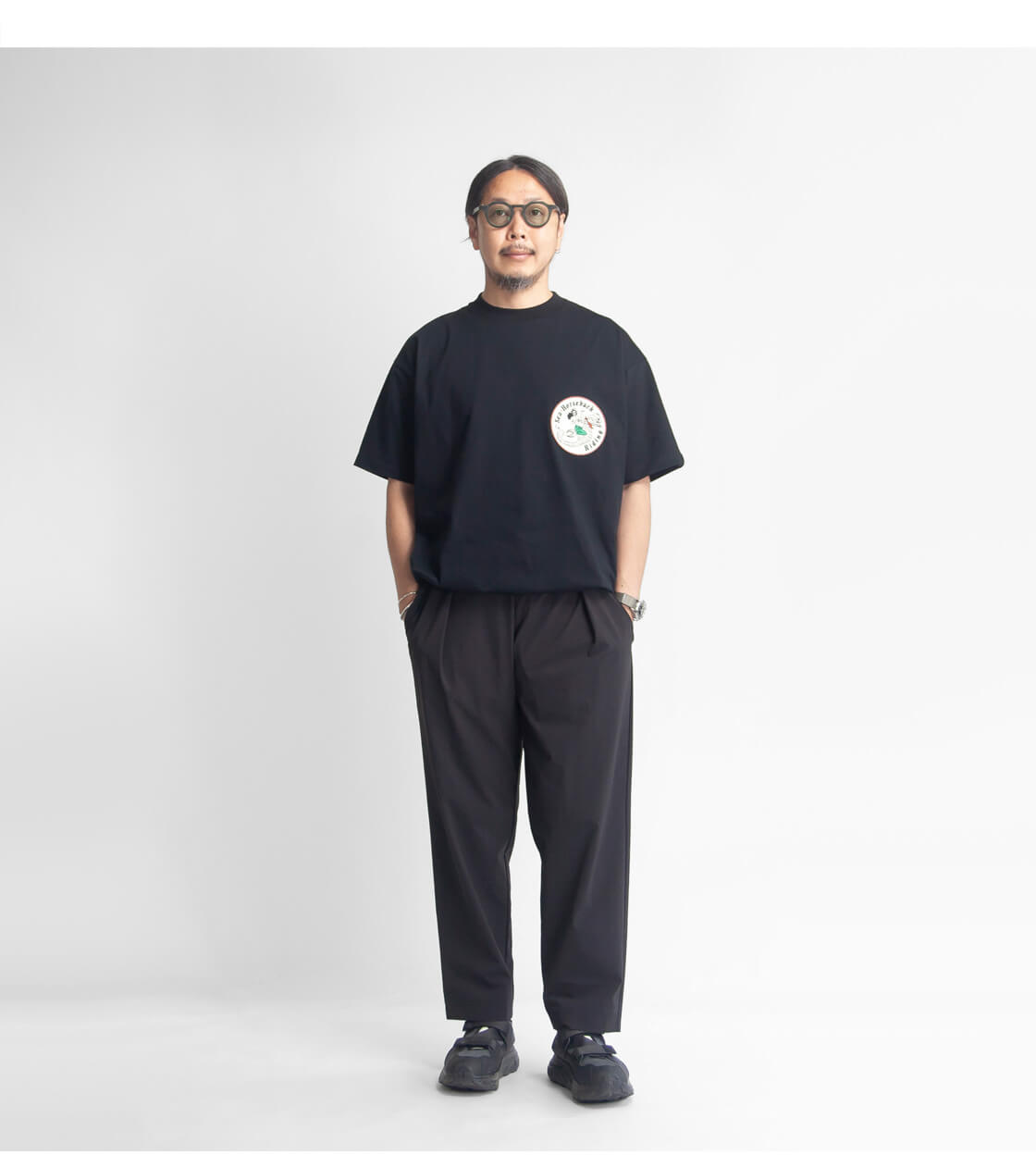 Mサイズを着用しました。ウエストはゴムが内蔵でフィット感があります。見た目にも程よくゆるいシルエットでラフさがあり、腰回りもゆとりがあるのでタイトに感じたり動きにくい部分はありません。テーパードシルエットなので野暮ったい感じはなく比較的すっきりした印象です。レングスはハーフクッションするかしないかぐらいです。ウエストのサイズ感なども含めて僕が着用するならMサイズがしっくりきますが、ワンサイズ上げてもっとゆったり着用しても良いです。
