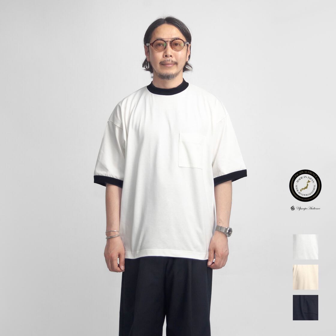 Upscape Audience(オーディエンス)より、襟・袖が配色になったレトロでスポーティーなモックネックリンガーTEEをご紹介。