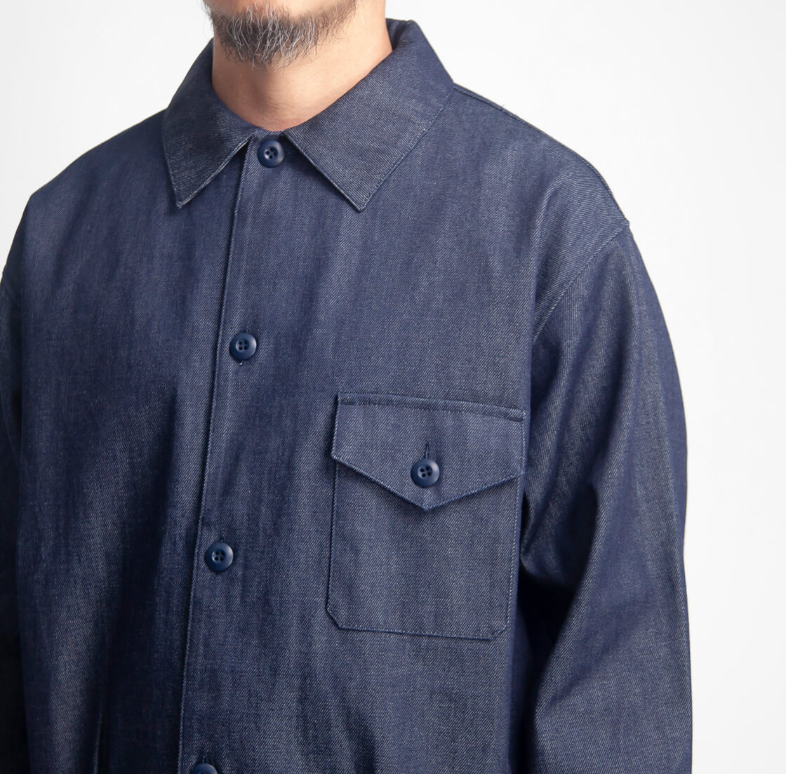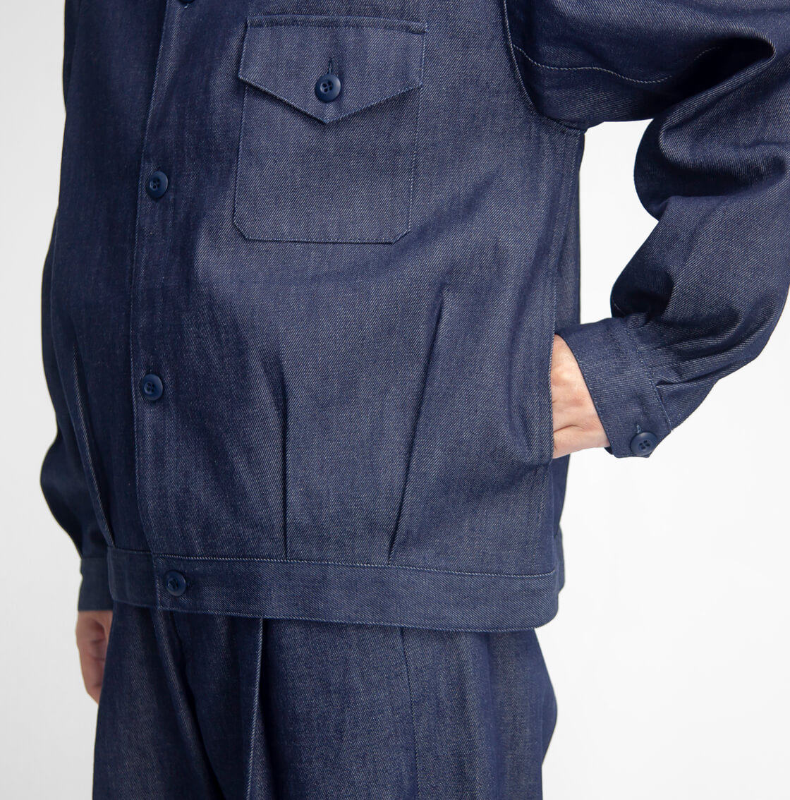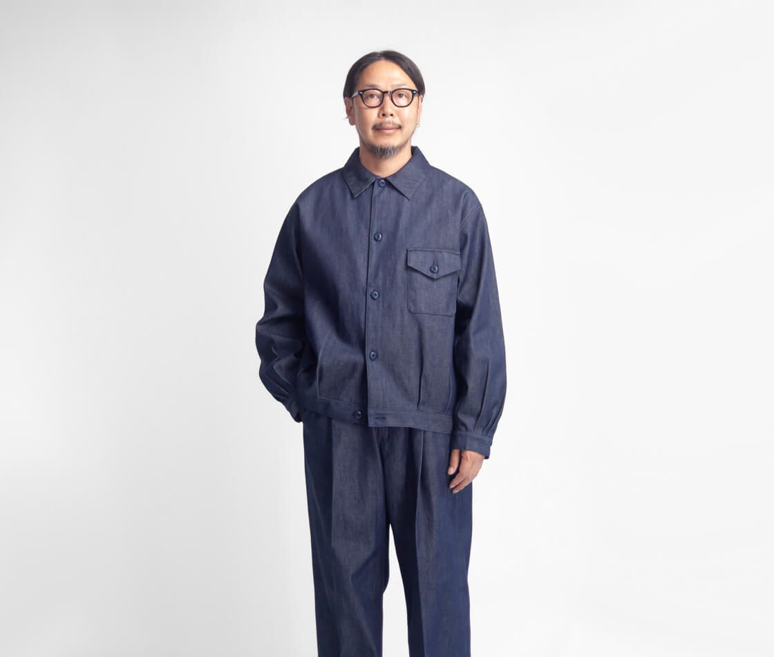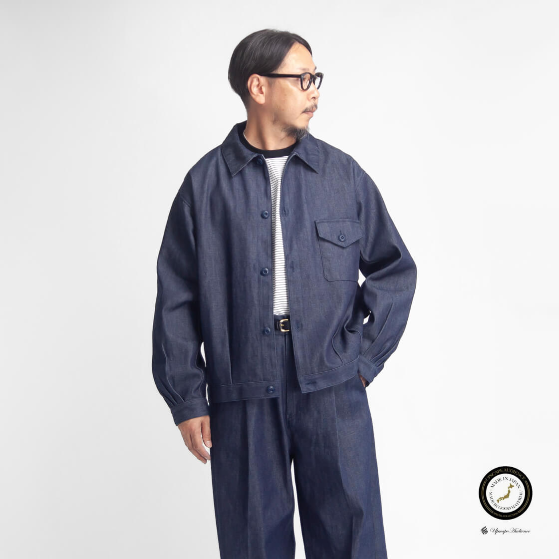 イタリア海軍のアイクジャケットをデザインソースに製作されたAudienceのデニムトラッカージャケット。オリジナルは両胸ポケット、裾に持ち出しがついていたりしますが、こちらは持ち出しを除き、ポケットを左胸のみに、袖口をボタン二つで調節のできるカフスにした現代にも着用しやすい仕様に改変させています。ゆったりワイドな身幅にショートな着丈、オリジナルと同様に裾の前後にタックを4つ設けることで、全体的に丸みのある立体的なシルエットに仕上げられているのがなんといっても特徴的。オリジナルにはない実用的なシームポケットが脇に設けられている点も良い。ミリタリー由来の無骨さを感じさせながらも、イマの雰囲気で着用できる一着です。また、色落ちの加工の入った10オンスデニムの同モデルも存在しますが、こちらは未加工の11オンスセルヴィッチデニムを用いた、日本製モデル。同素材のパンツ(別売り)と合わせてのセットアップがかなりイイ感じにまとまるので、是非上下で着用頂きたい。