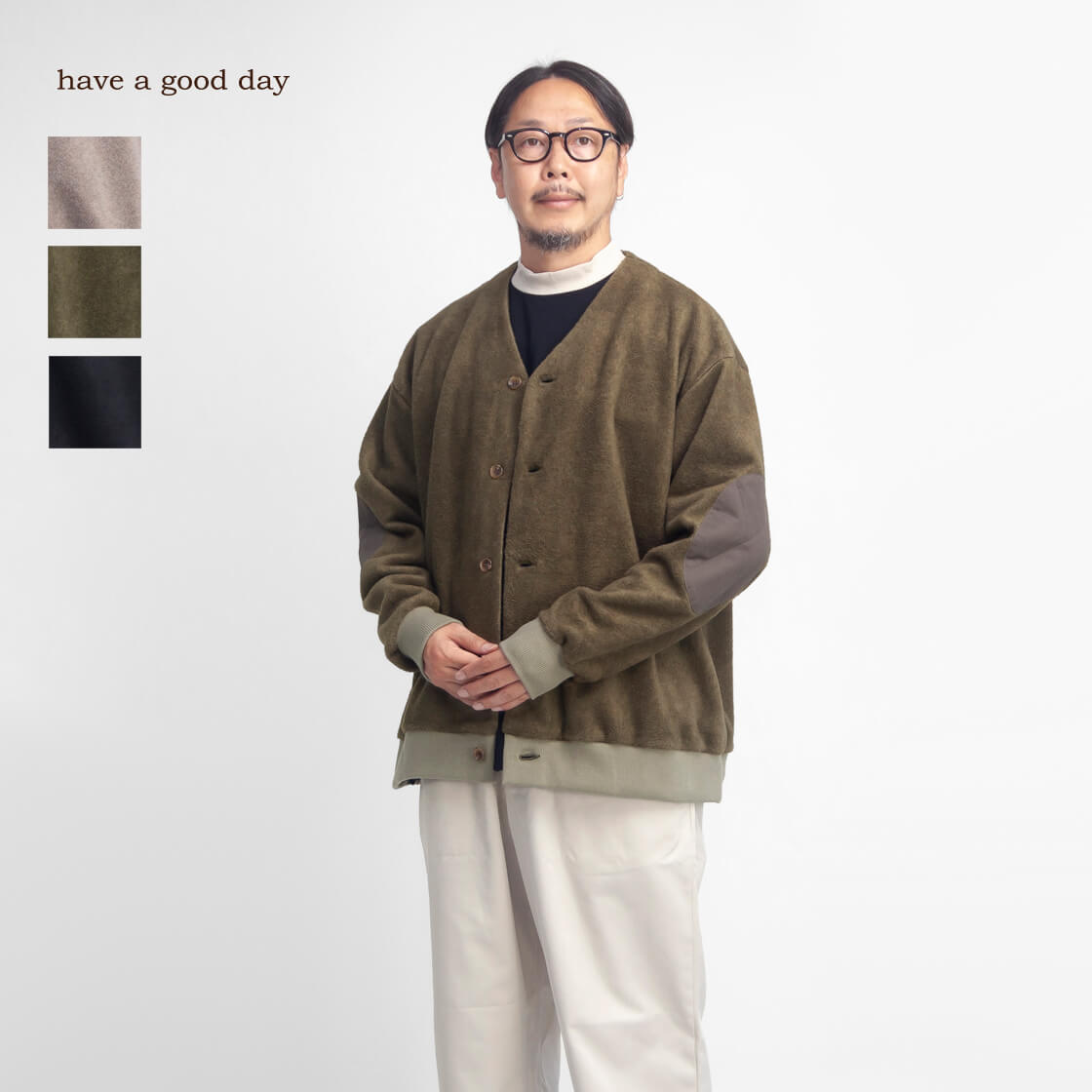 優しい手触りに暖かくて軽いメルトンフリースを用いたhave a good dayのカーディガン「Melton fleece cardigan」。厚みのある生地のボリュームと相反する、着心地の軽さとウォーム感が大きな魅力の一着です。肘に当てられた伸び止めのエルボーパッチがデザインとしてもアクセントに。裾と袖口は綿100%リブ生地で切り替え、締まりが強すぎない程よいテンションが心地よい。