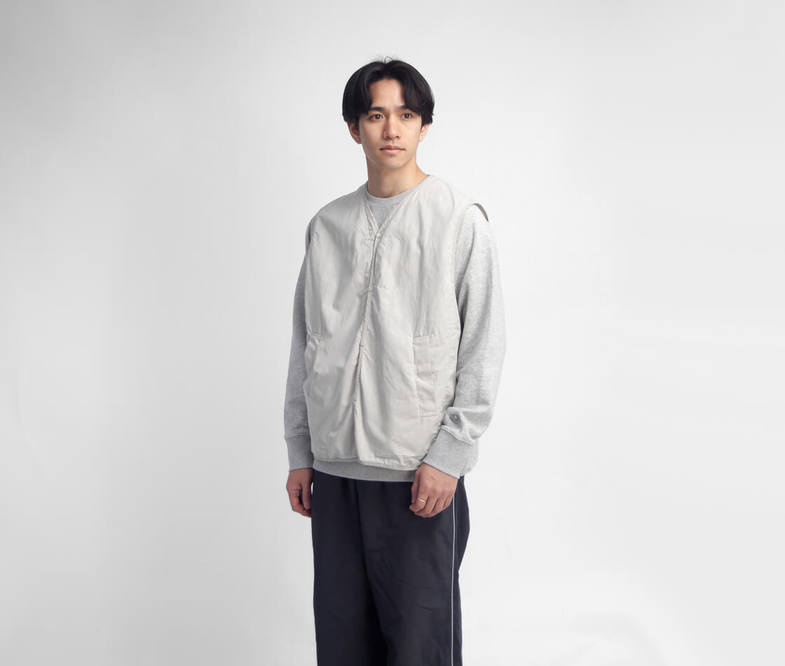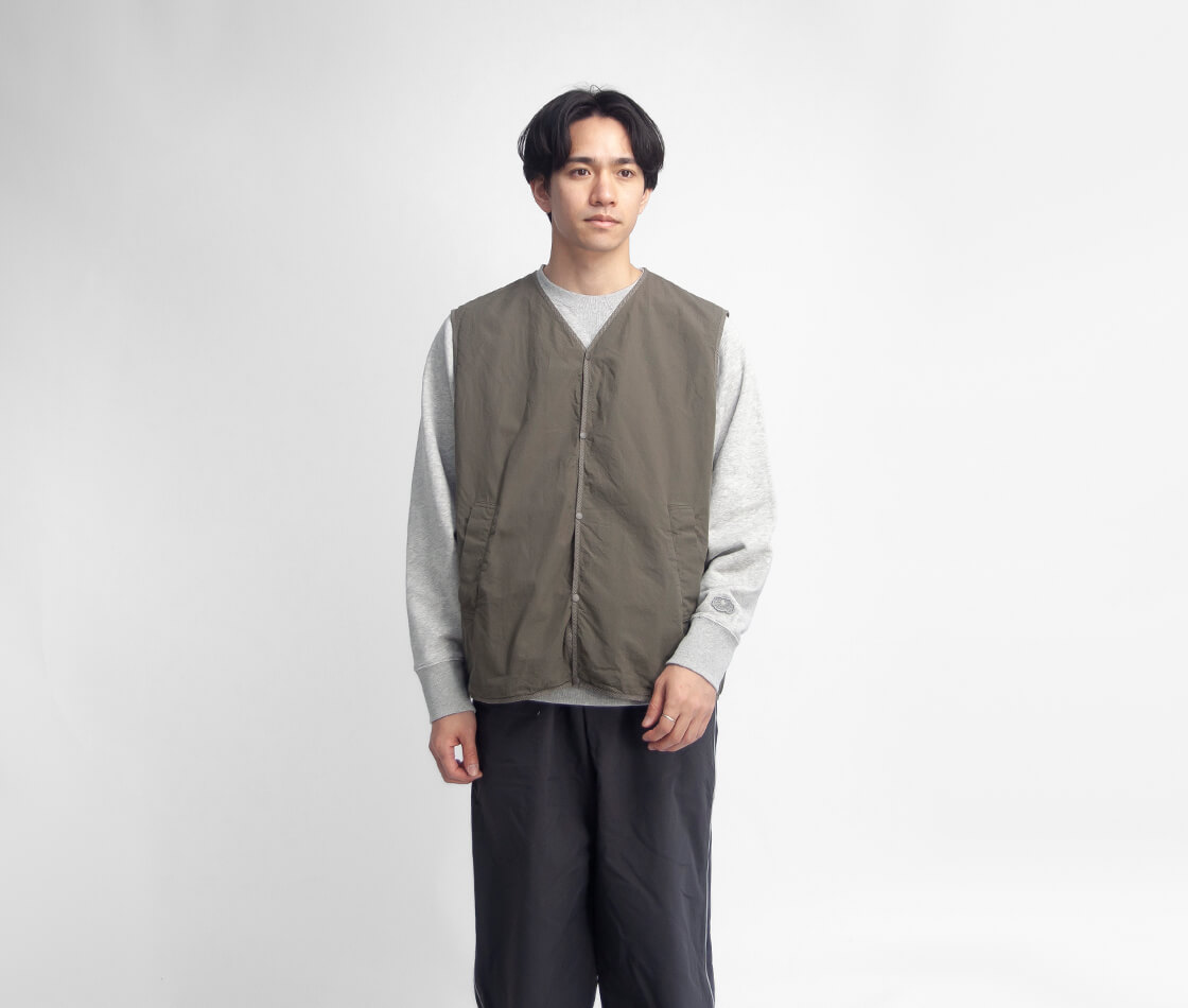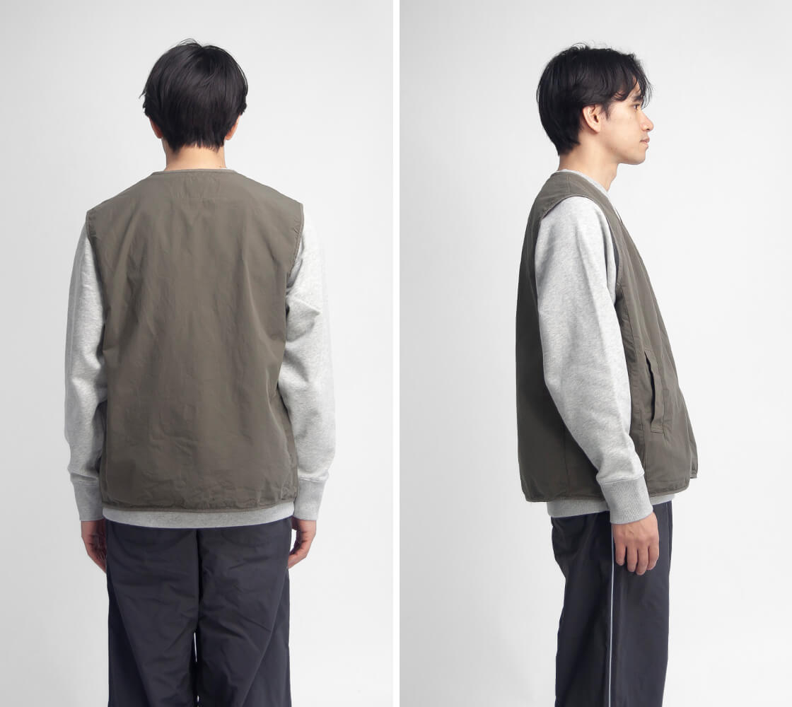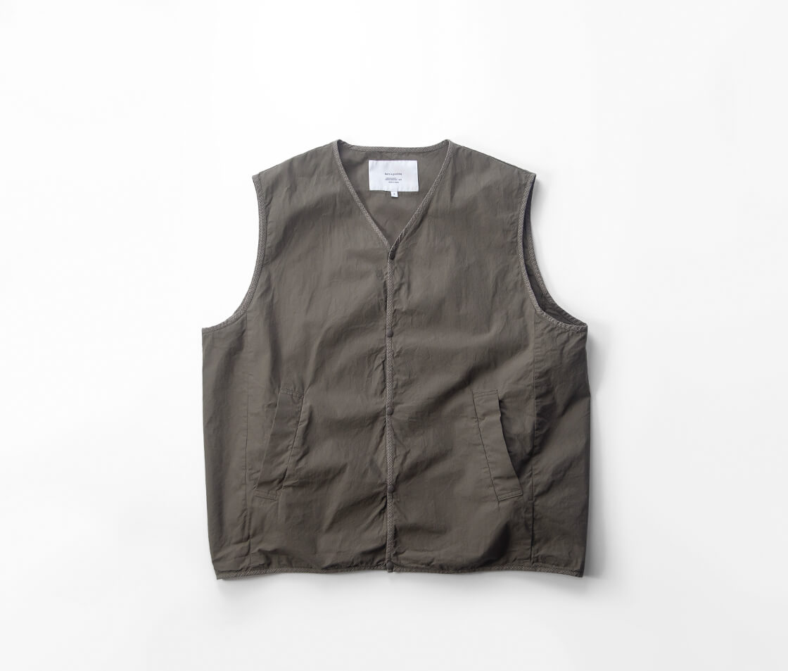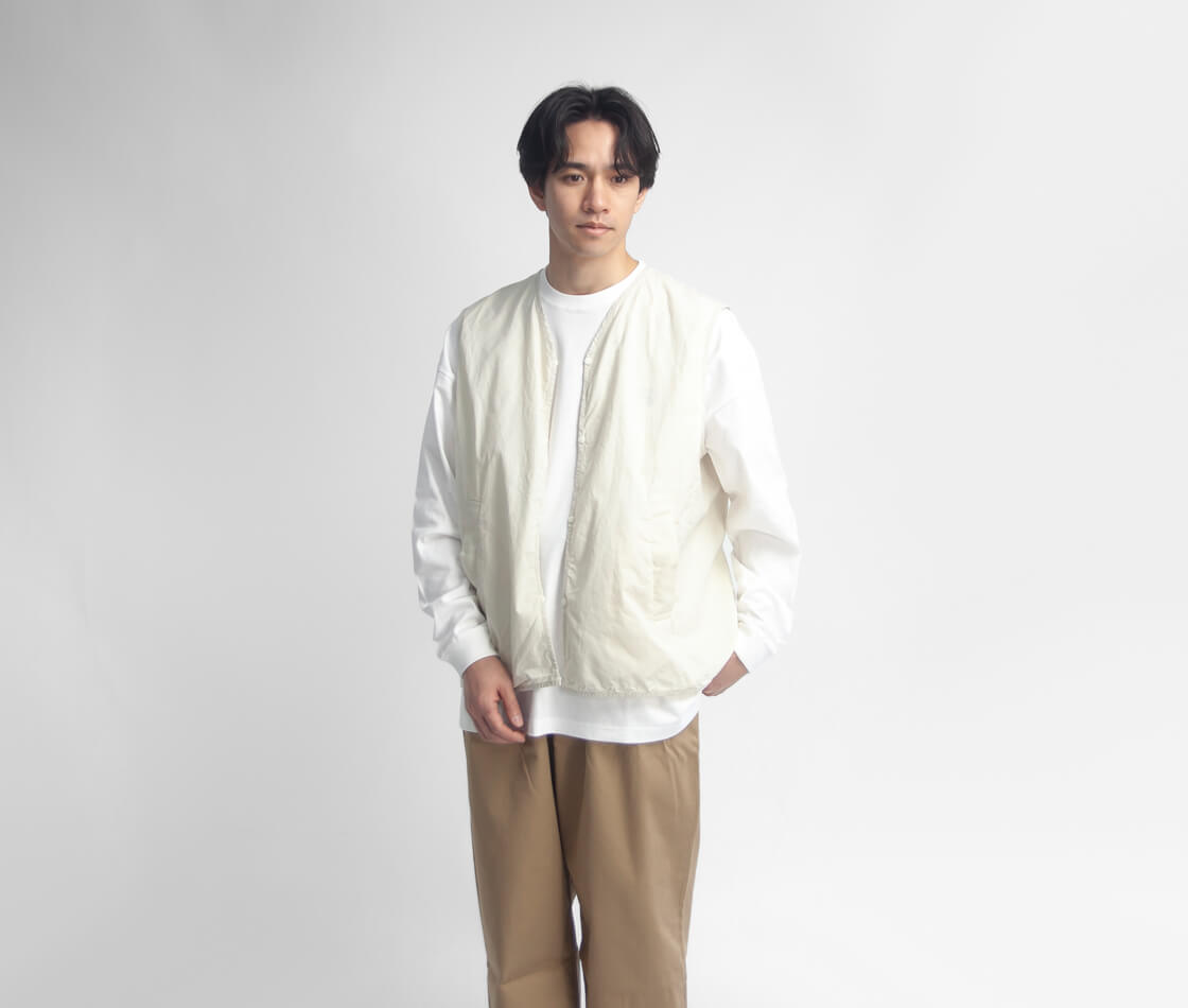 まるで画用紙の様な質感を持つhave a good dayのベスト、その名も「Paper vest」。スウェットの上からも無理なく羽織れる、程よくゆとりのあるサイズ感。カラッと軽い着用感で、重ね着してもストレスを感じさせません。前立てやアームホール、裾に施されたチェック柄生地のパイピングは、ミニマルな佇まいの中にさりげない遊び心を添えるディテール。主張しすぎず、それでいて確かな存在感に。腰位置には実用性の高い箱ポケットを配置し、フロントはプランサーボタン仕様。パチッと小気味よい開閉感も、このベストならではの心地よさです。やや浅めに設定されたVゾーンは、いやらしさがなく、カジュアルなスタイルに自然と馴染みます。