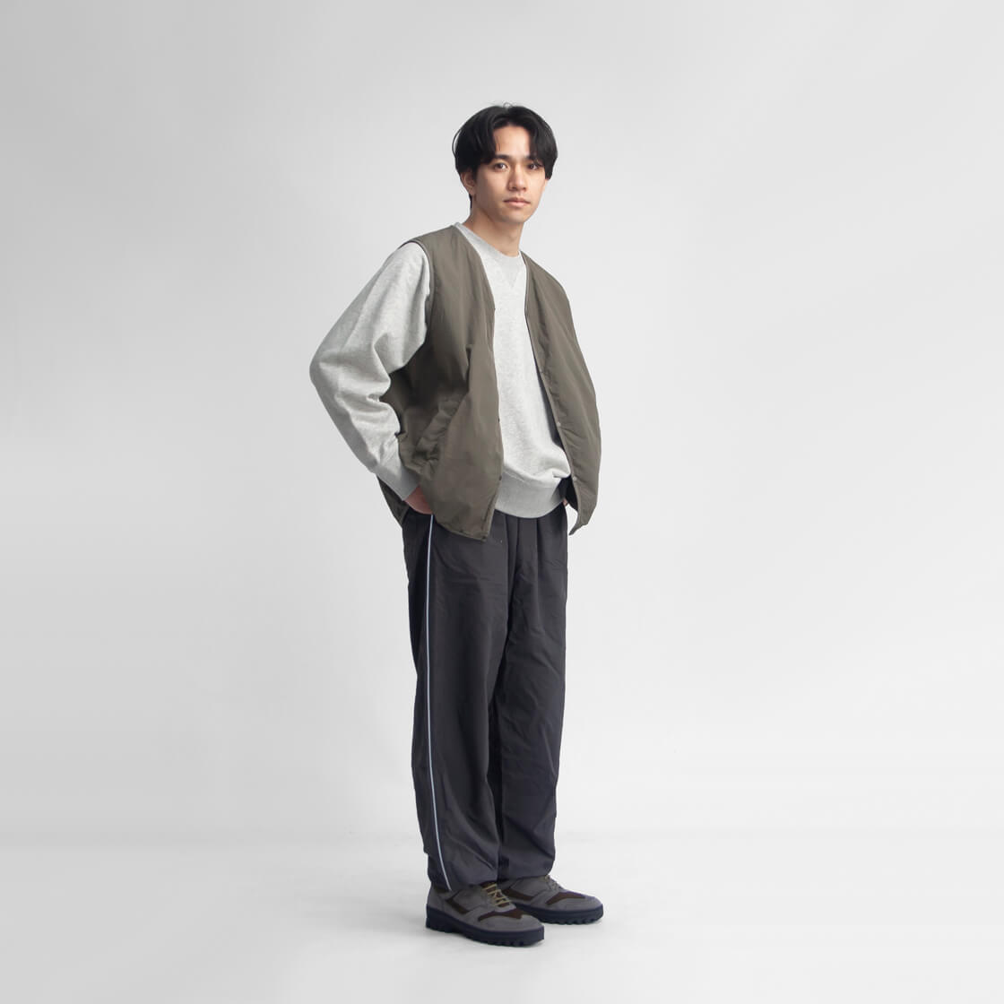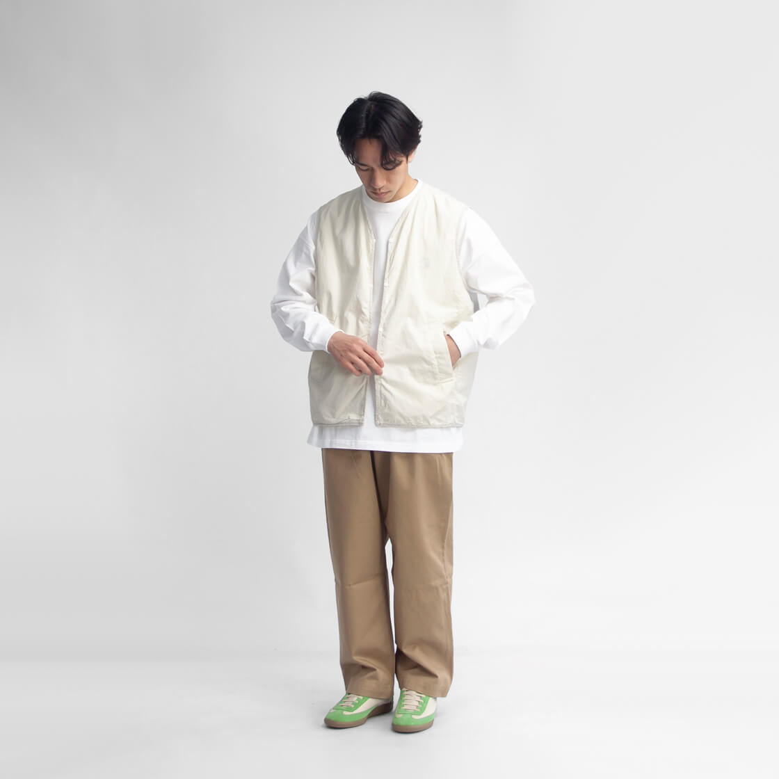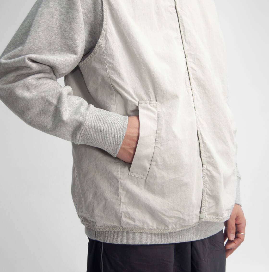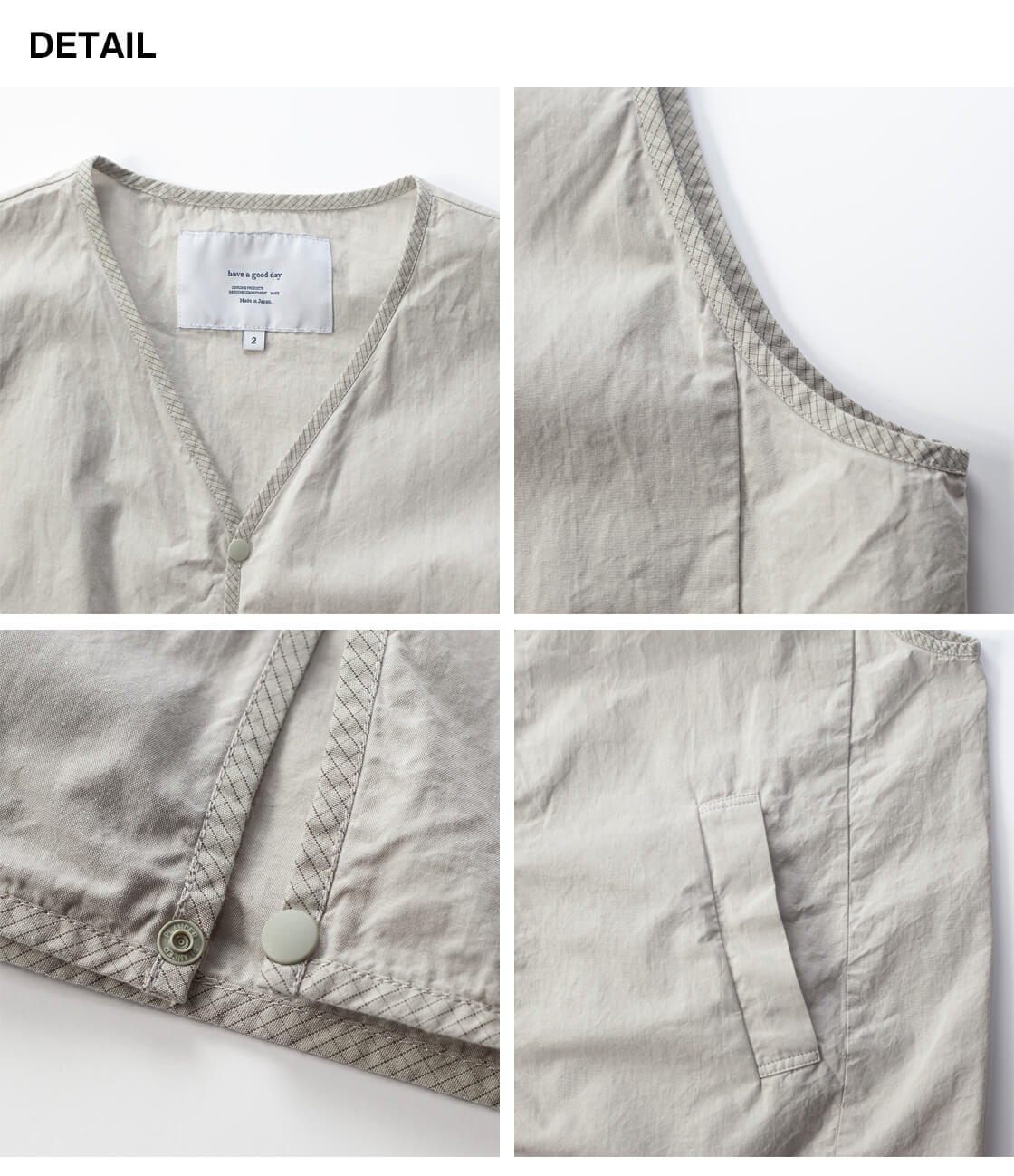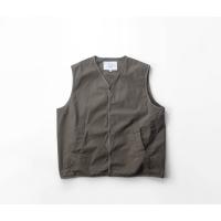 まるで画用紙の様な質感を持つhave a good dayのベスト、その名も「Paper vest」。スウェットの上からも無理なく羽織れる、程よくゆとりのあるサイズ感。カラッと軽い着用感で、重ね着してもストレスを感じさせません。前立てやアームホール、裾に施されたチェック柄生地のパイピングは、ミニマルな佇まいの中にさりげない遊び心を添えるディテール。主張しすぎず、それでいて確かな存在感に。腰位置には実用性の高い箱ポケットを配置し、フロントはプランサーボタン仕様。パチッと小気味よい開閉感も、このベストならではの心地よさです。やや浅めに設定されたVゾーンは、いやらしさがなく、カジュアルなスタイルに自然と馴染みます。