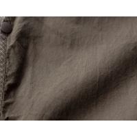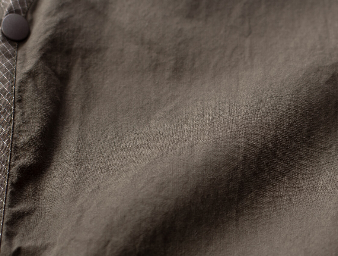 本体に用いているのは、シャツ生地定番のコットン100%のブロード生地。ただ、定番のブロードと大きくことなるのは、硬めのハリと細かいシワ感のある、まるで画用紙の様な質感。それは生地にワッシャー加工と硬仕上げを施しているから。ワッシャー加工を施すことで、生地表面には自然なシワ感と奥行き感が生まれ、洗いざらしの表情に。そこにあえて硬仕上げを加えることで、ハリとコシをしっかりキープ。薄手で軽やか、そして立体感のある佇まいに仕上がっています。