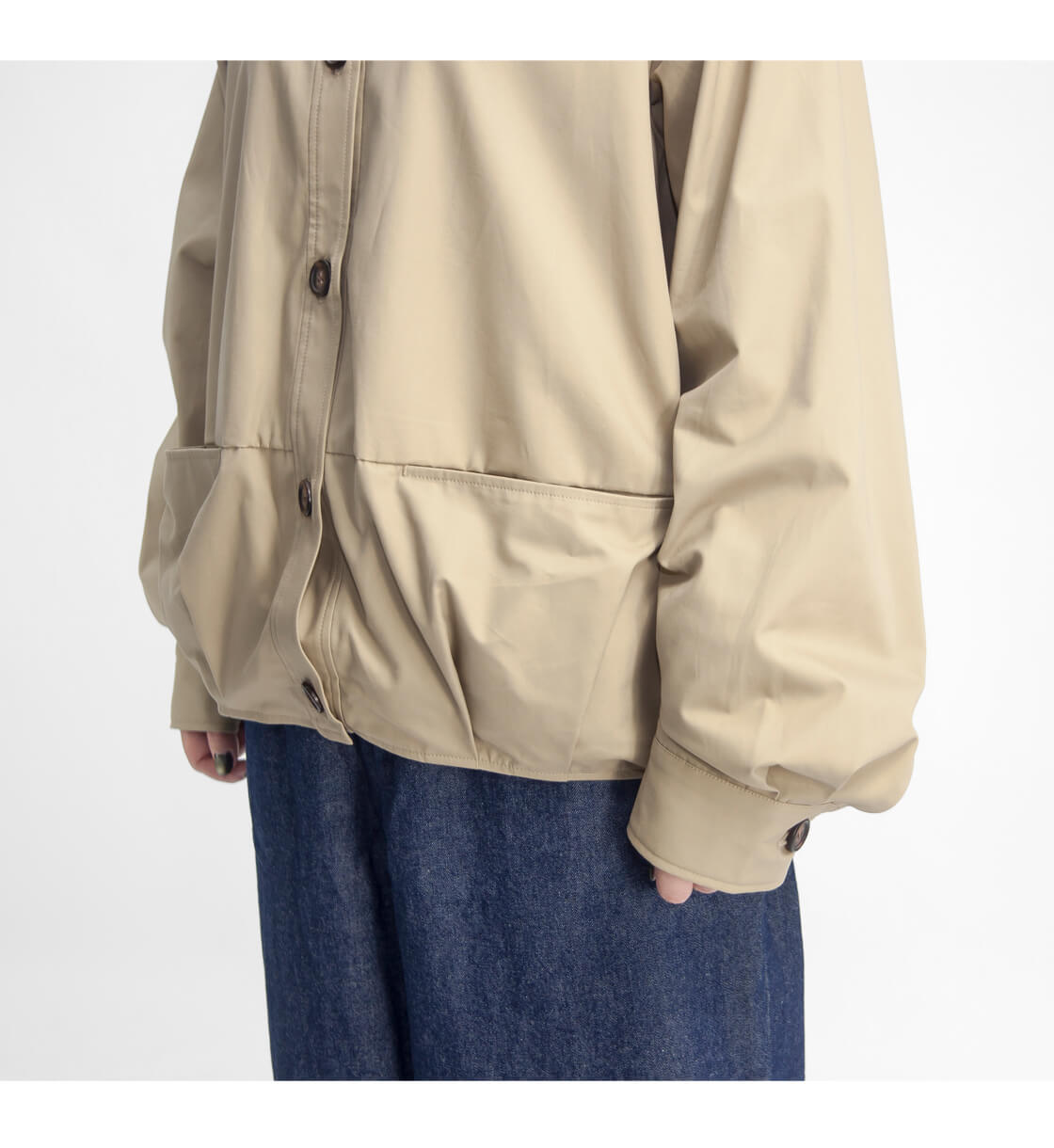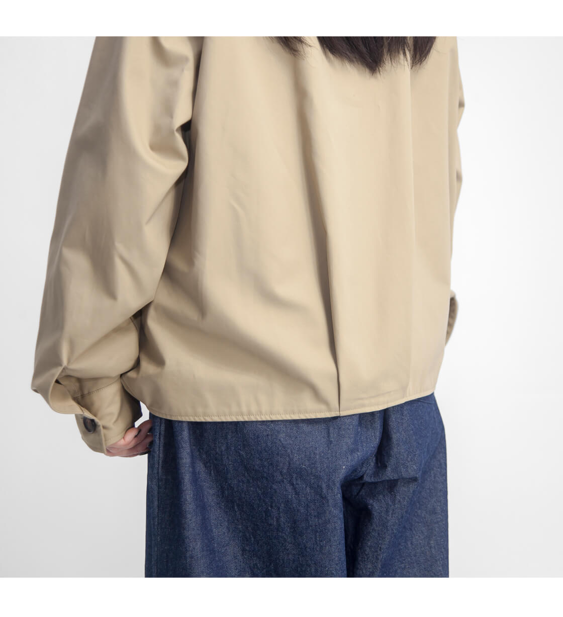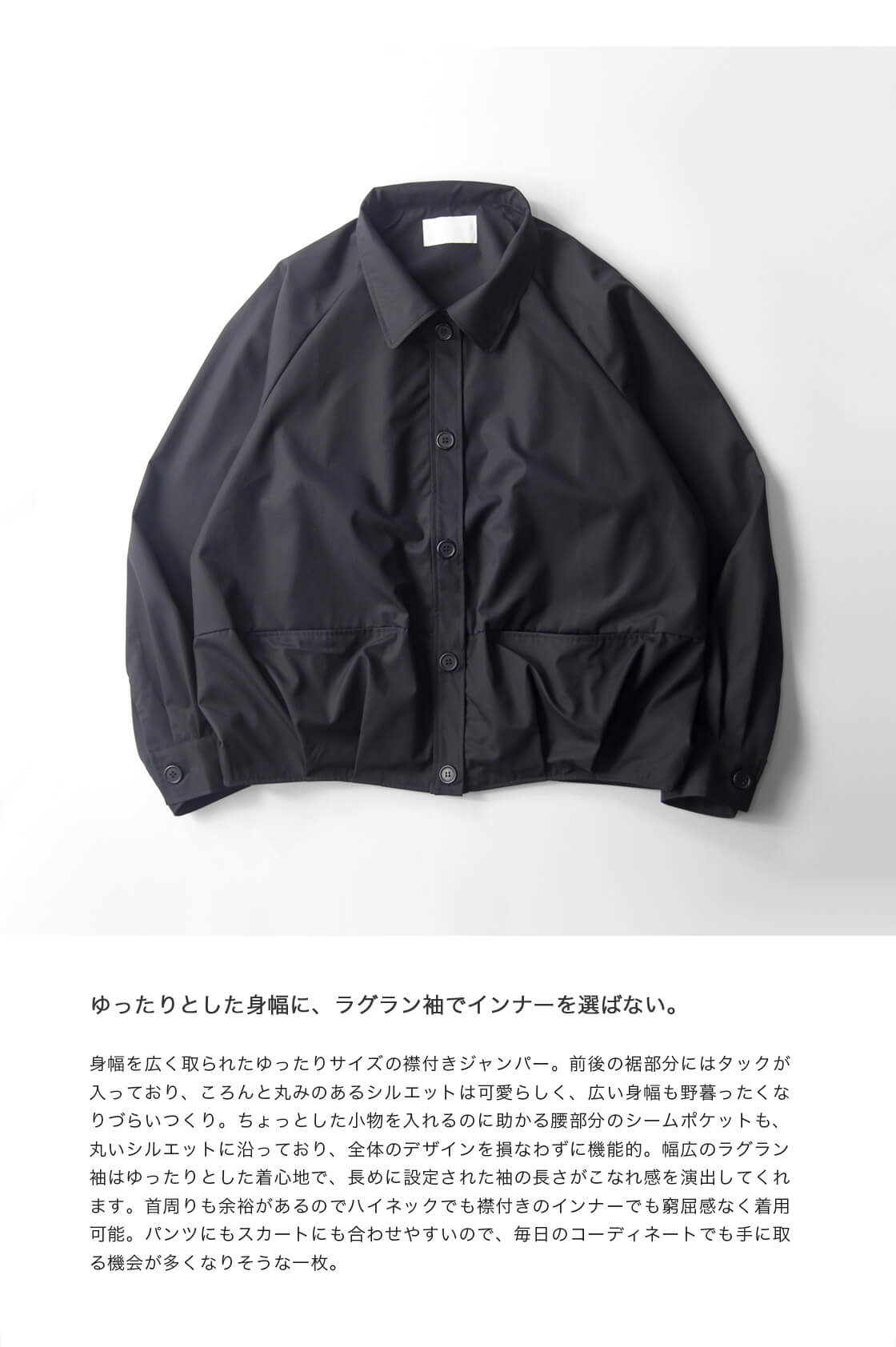 身幅を広く取られらゆったりとした襟付きのジャンパー。前後の裾部分にはタックが入っており、ころんとしたシルエットは可愛らしく、広い身幅も野暮ったくなりづらい。