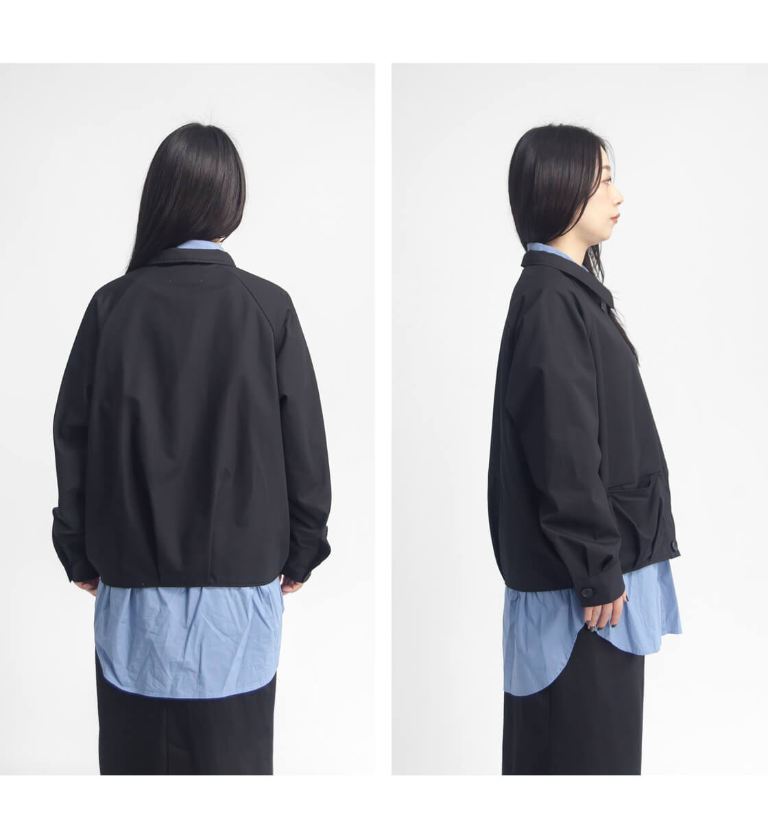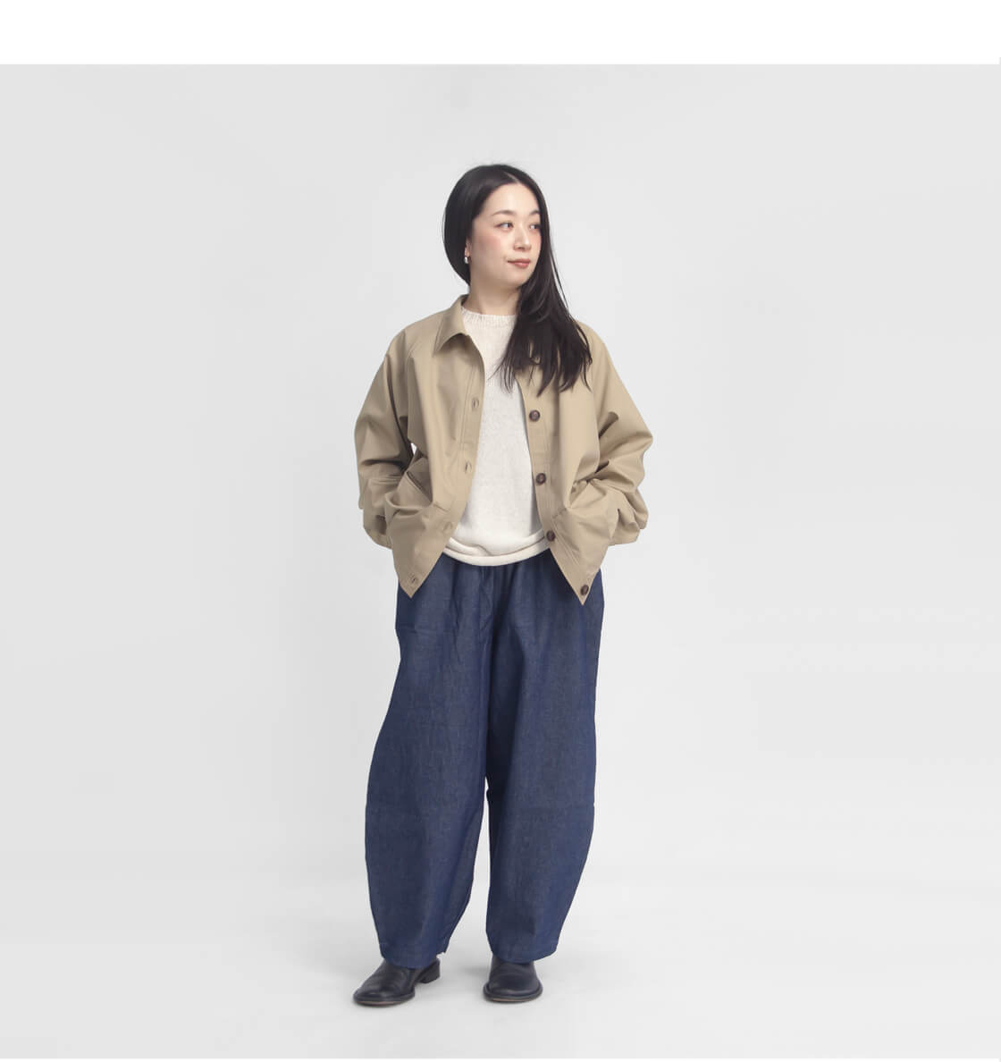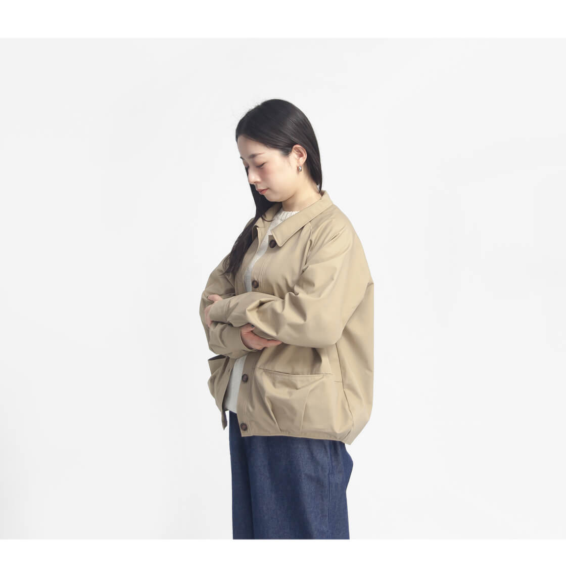 身幅を広く取られらゆったりとした襟付きのジャンパー。前後の裾部分にはタックが入っており、ころんとしたシルエットは可愛らしく、広い身幅も野暮ったくなりづらい。