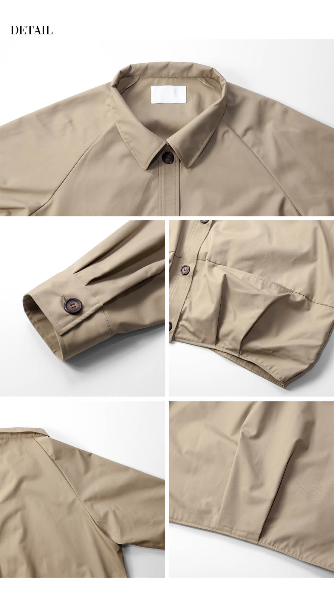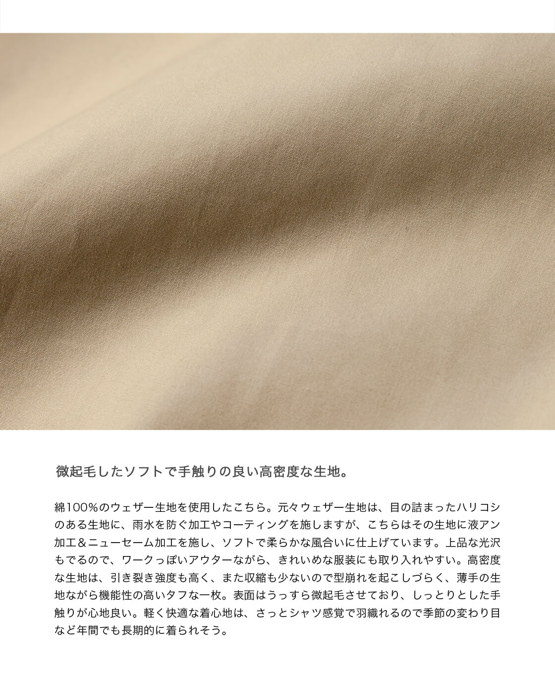 生地には綿100%のウェザー生地を使用しており、目の詰まったハリコシのある生地に液アンとニューセーム加工を施し、ソフトで柔らかな風合いに仕上げています。