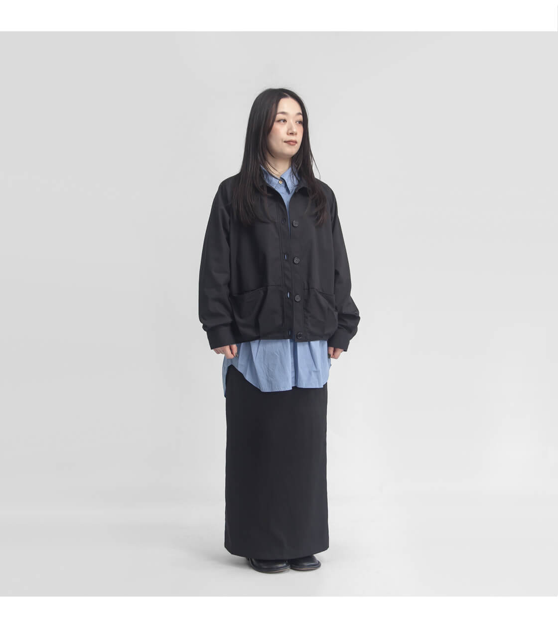 ゆったりとした身幅で、ボタンを閉めた状態でも窮屈感はありません。やや袖丈は長いですが、袖口に向かって窄まっていることもあり気になるほどではありません。着丈はヒップに少しかかるほどでやや短めです。