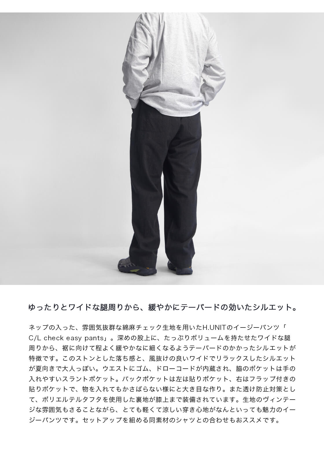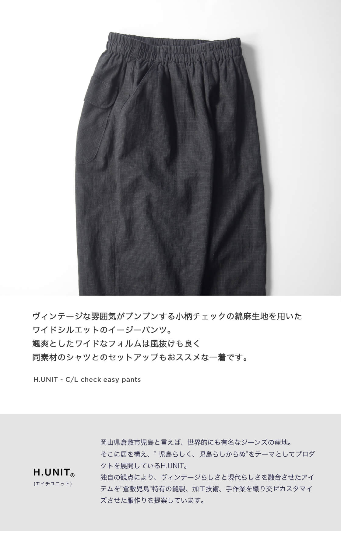 H.UNIT(エイチユニット)から、ヴィンテージな雰囲気がプンプンする小柄チェックの綿麻生地を用いた、ワイドシルエットのイージーパンツをご紹介。