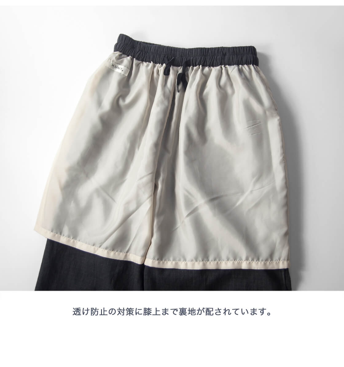 ウエストにゴムが内蔵され、透け防止の裏地が膝上までついています。