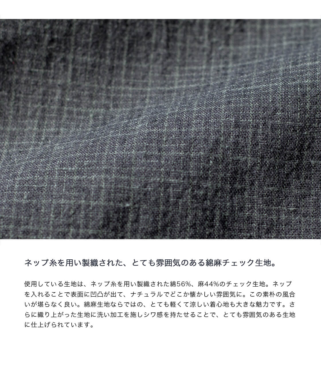 本体に使用している生地は、ネップ糸を用い製織された綿56%、麻44%のチェック生地。