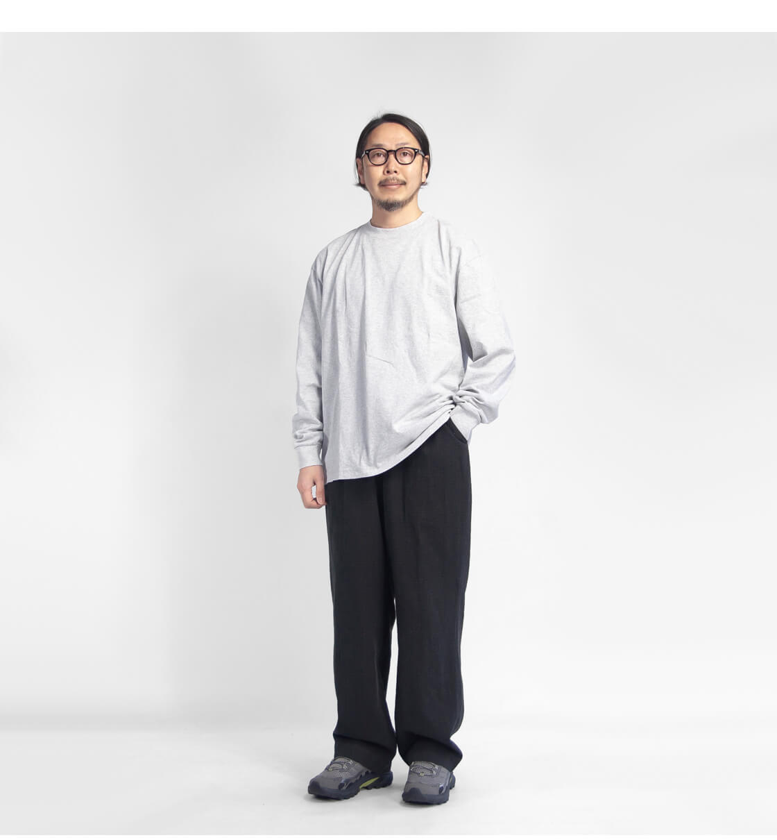 深めの股上に、たっぷりボリュームを持たせたワイドな腿周りから、裾に向けて程よく緩やかに細くなるようテーパードのかかったシルエットが特徴です。