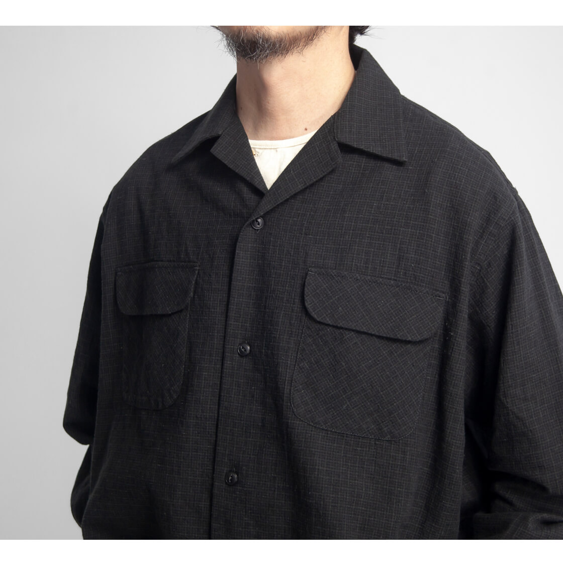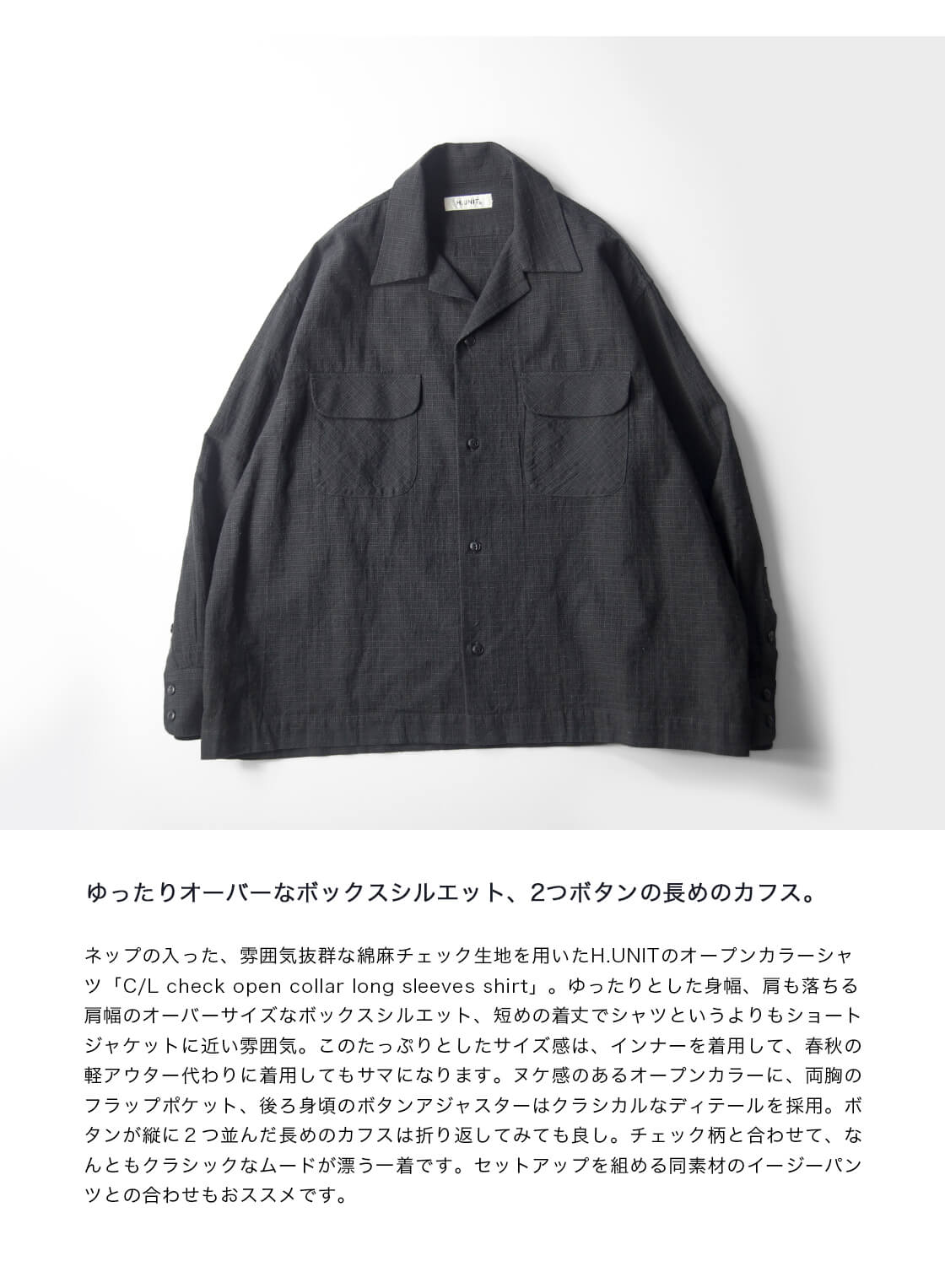 ネップの入った、雰囲気抜群な綿麻チェック生地を用いたH.UNITのオープンカラーシャツ「C/L check open collar long sleeves shirt」。