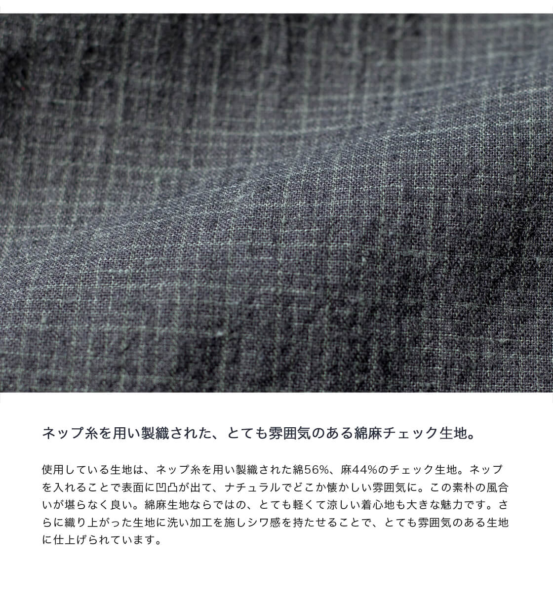 本体に使用している生地は、ネップ糸を用い製織された綿56%、麻44%のチェック生地。