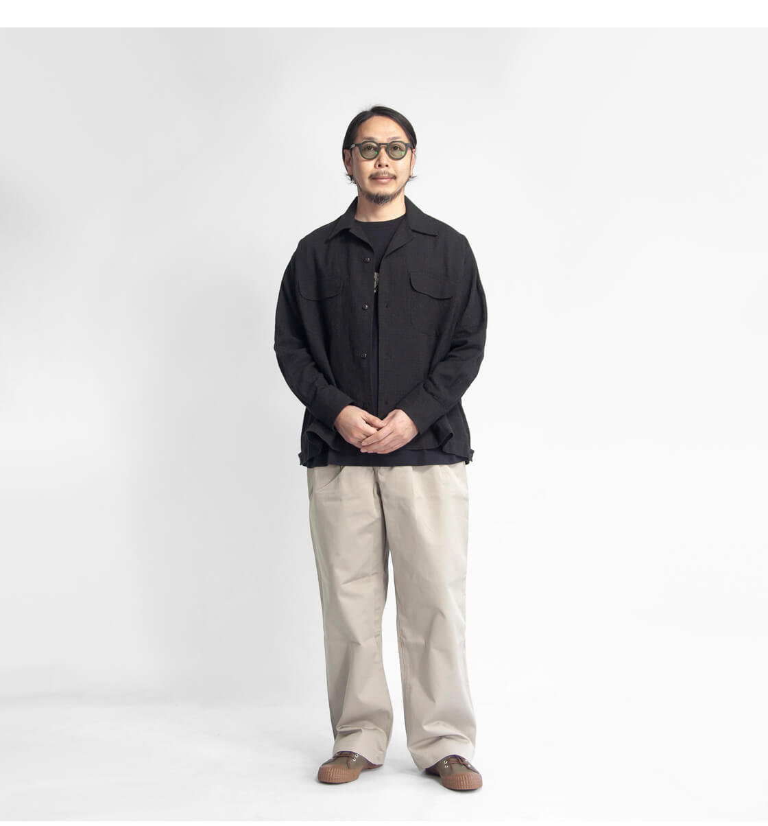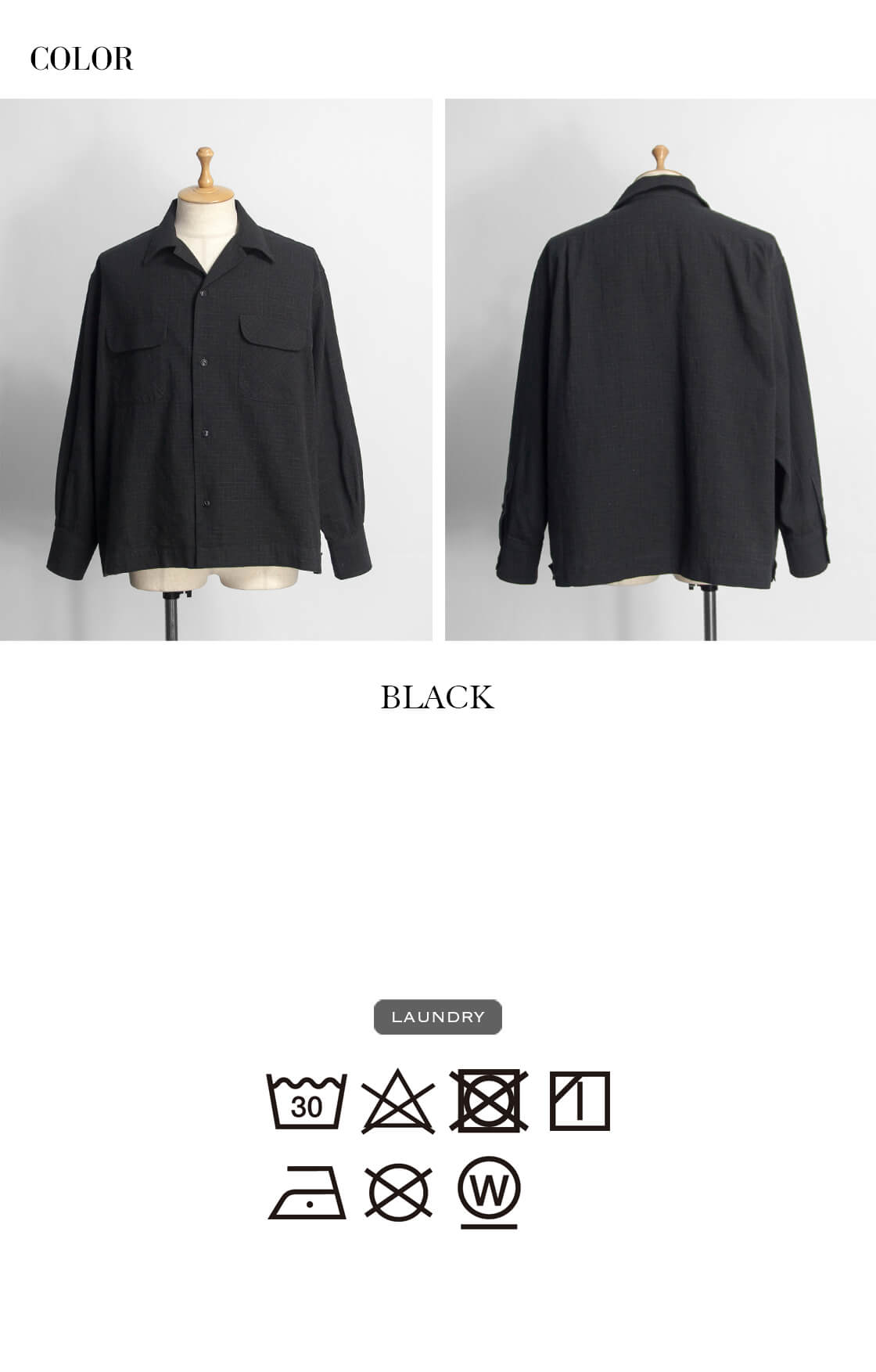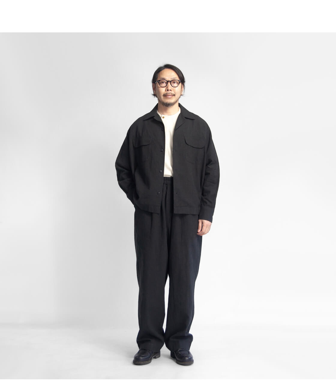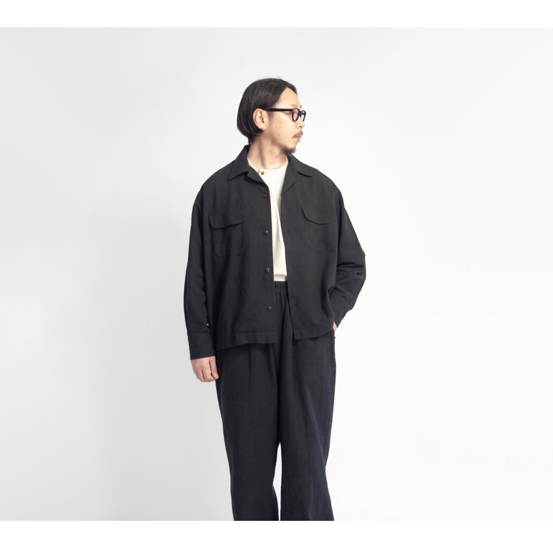 綿麻チェック生地を用いたH.UNITのオープンカラーシャツ「C/L check open collar long sleeves shirt」。