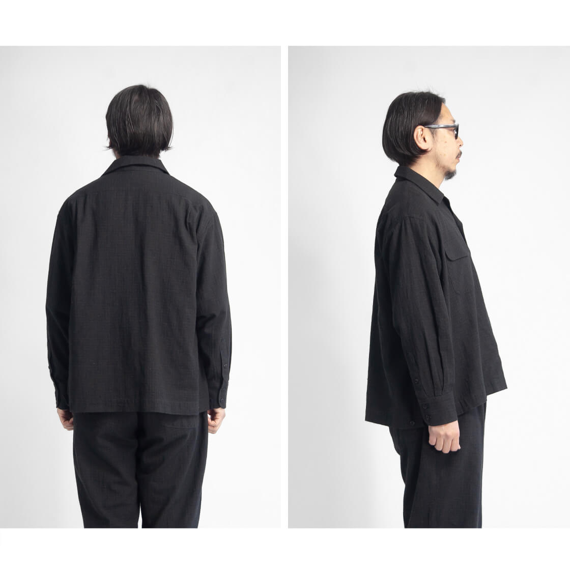 ゆったりとした身幅、肩も落ちる肩幅のオーバーサイズなボックスシルエット、短めの着丈でシャツというよりもショートジャケットに近い雰囲気。