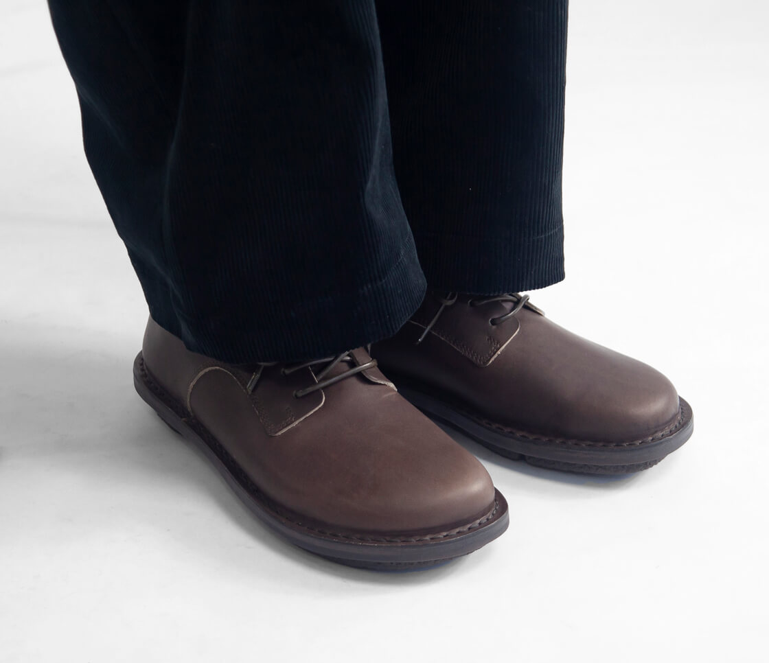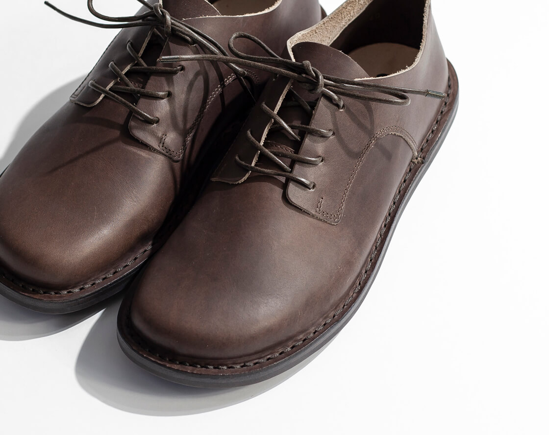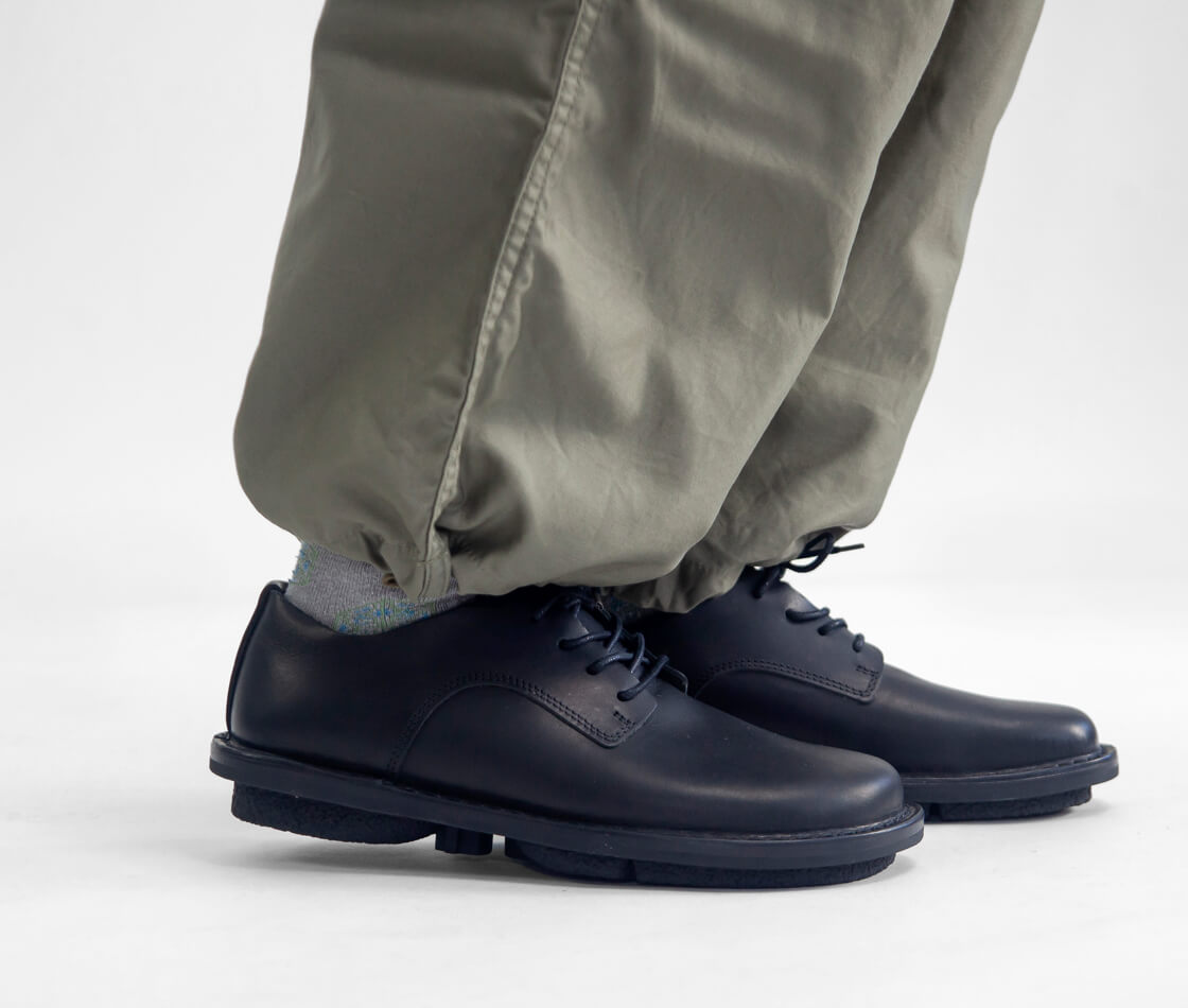 trippenのモデルでも看板と言えるクラシックなレースアップシューズ「DERBY」にクリソツながら、価格をグッと抑えたのが「Ernie」。品質を妥協せず、裁断と縫製を最小にとどめ、可能な限り簡素化することでコストを抑えているのです。「DERBY」との大きな違いは、ソールのステッチが1重なのと、アッパーの革が1重になっていること。ただ厚みのある革を用いているので強度はそのまま。他に外羽根の形状が変わっていたりステッチが減ったりなどありますが、木型は一緒なので履き心地はほぼ変わらず。trippenに依頼した当店のみの展開となる別注カラー「CEMENT」は、グレイッシュなブラウン色で都会的な雰囲気に仕上がりました。