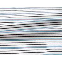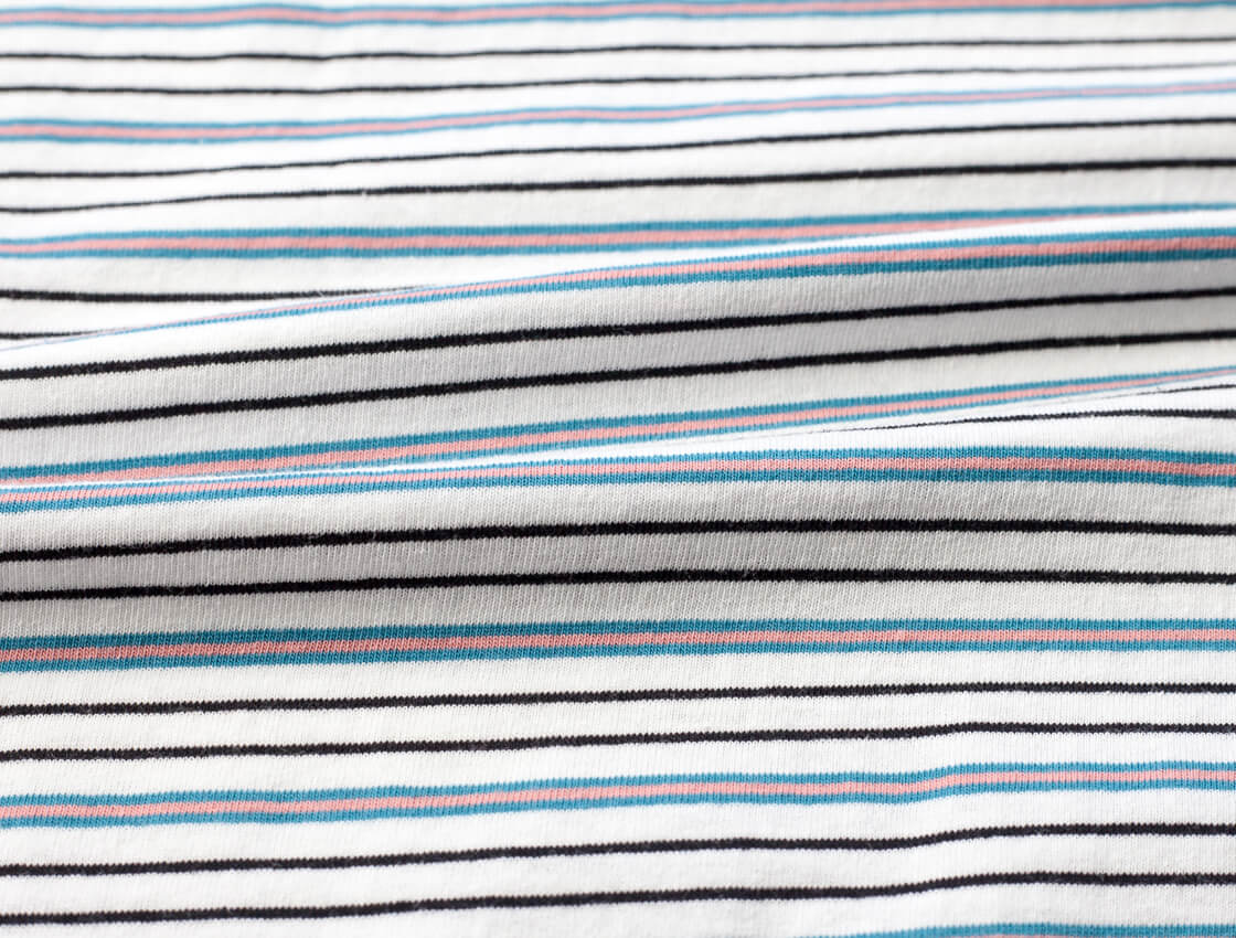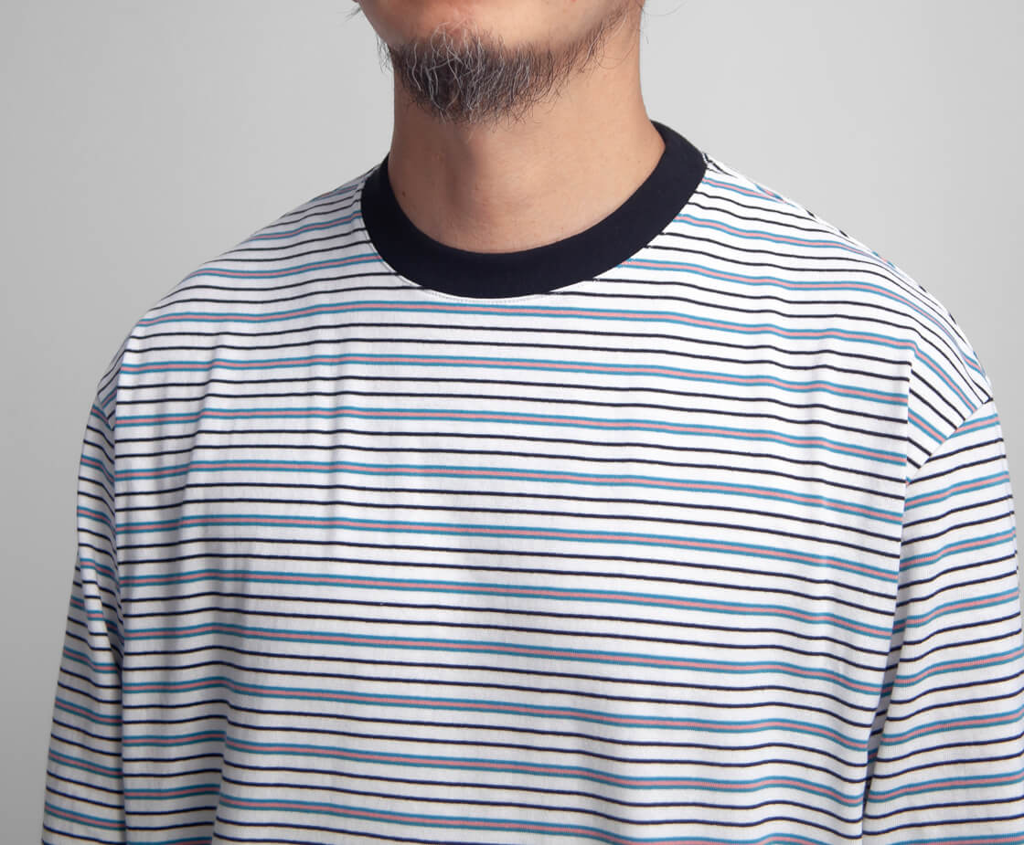 本体に用いているのは、18番手のオープンエンド糸(単糸)を用いた天竺生地なのですが、カラッとしたシャリ感、ふっくらとした軽さを感じて頂ける生地です。旧き良きアメリカの空気感を感じさせるヴィンテージ感、ムラ感、粗野な表情が特徴で、洗いこむことで目が詰まり、生地表面には凹凸感も出てきます。多色を用いたマルチボーダーは、レトロで雰囲気も抜群に良しです。生地自体は厚すぎず、薄すぎない6〜7オンスほどの厚みで軽やかな着心地も特徴です。