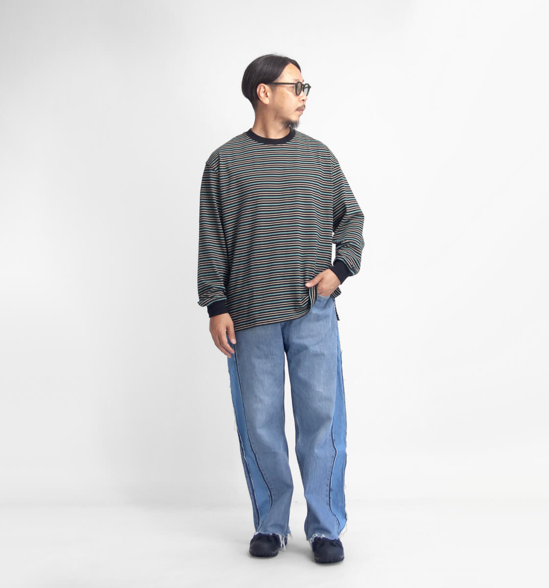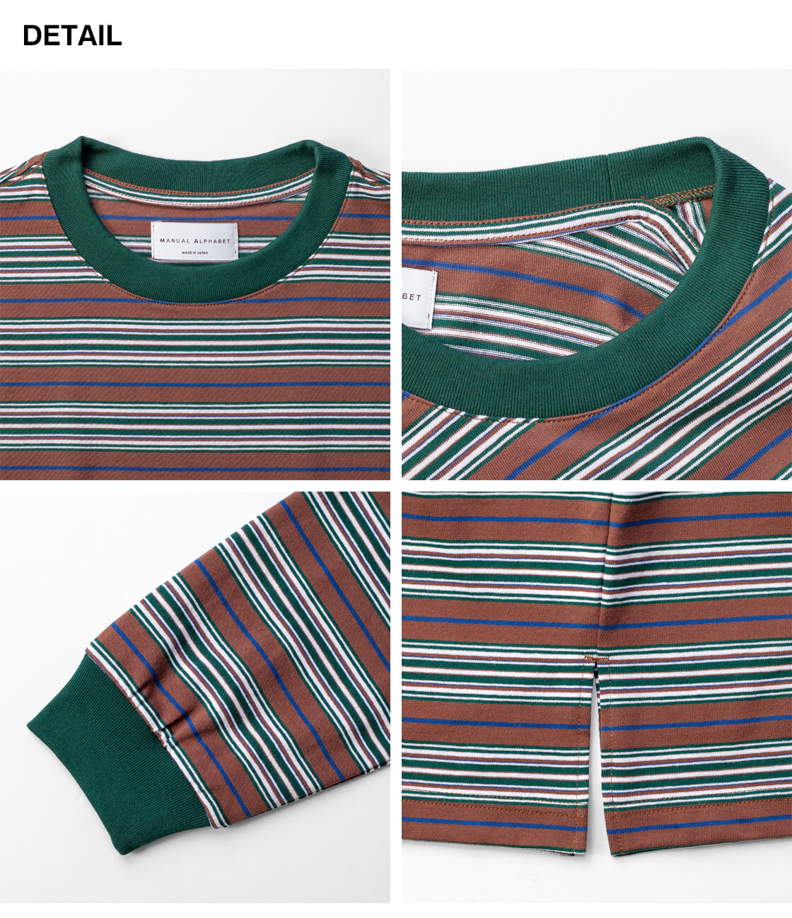 オープンエンド糸を用いたドライでアメリカンな風合いに、レトロで雰囲気抜群なマルチボーダーが印象的なMANUAL ALPHABETの長袖Tシャツ「MULTI BORDER WIDE LS TEE」。何がイイって、やっぱりこの鮮やかで90sを感じさせるボーダー柄と、アメリカンな生地の雰囲気。襟と袖口はフライス生地で切り替え、袖にギュッと絞りを出しています。この袖口の膨らみは好みが分かれると思いますが、個人的には大好物。襟裏から肩にかけてはタコバインダーでヨレを防ぎます。裾の両脇には、やや深めのスリットが入り、手をパンツのポケットに突っ込んだ時もシルエットが崩れにくい仕様。