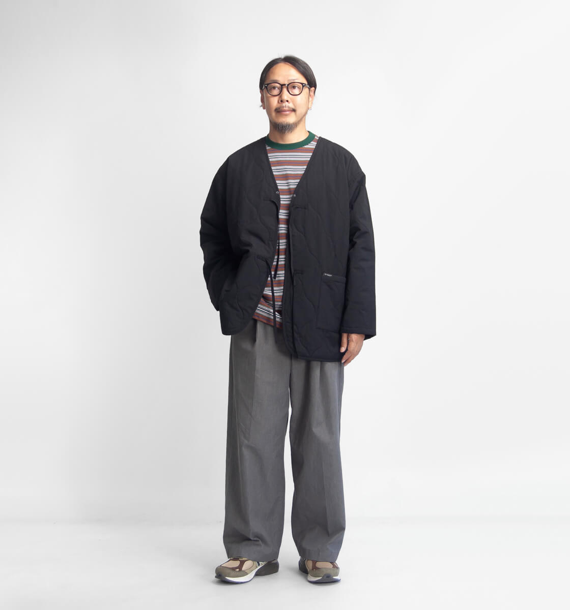 シルエットに関してはMANUAL定番のワイドシルエット。着丈は長くならないように程よい長さに設定しつつ、身幅・肩幅はゆったりとした全体的にワイドなシルエットです。ただ腕周りは太く見えないよう、身幅に対して細幅に設定しているので、大き目なサイズ感ながら大人見えするフォルムに。