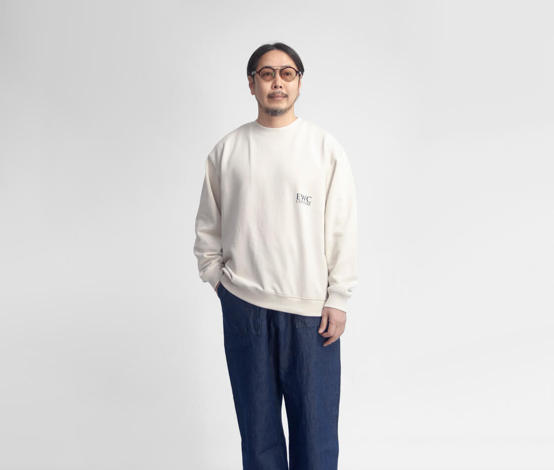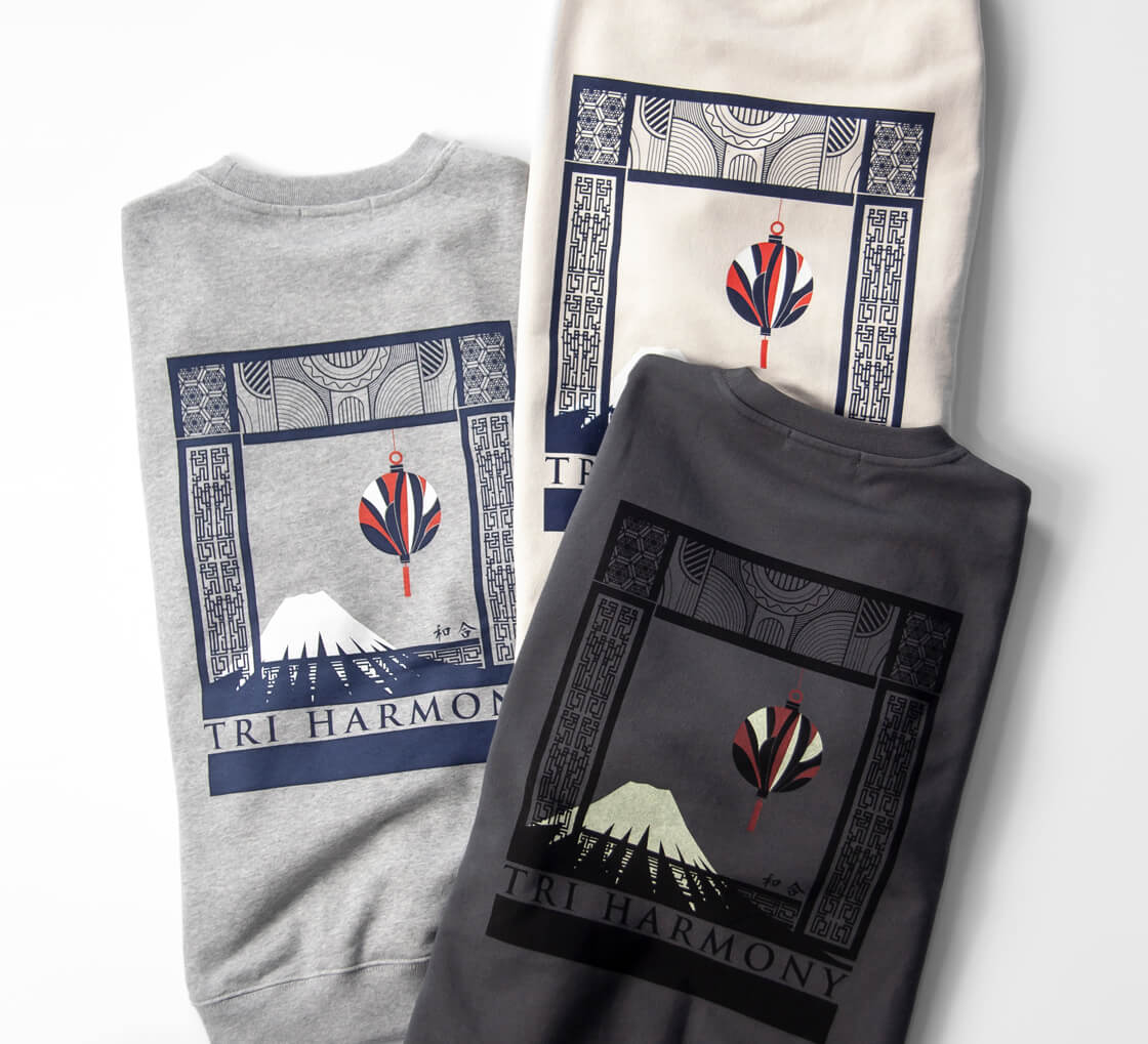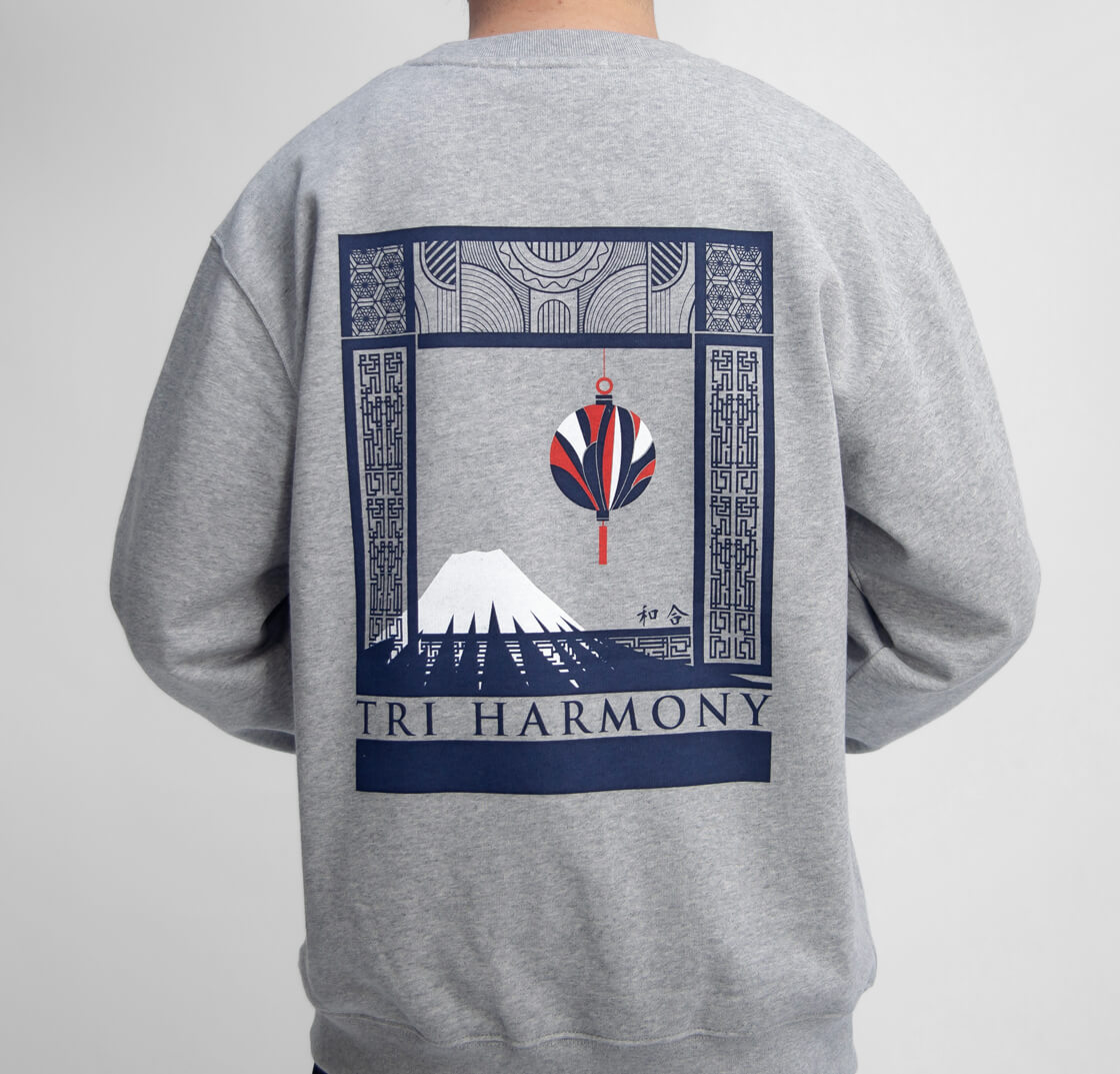 和・洋・中折衷な文化をバックプリントで表現したロングシーズン着用しやすいスウェットシャツ。
