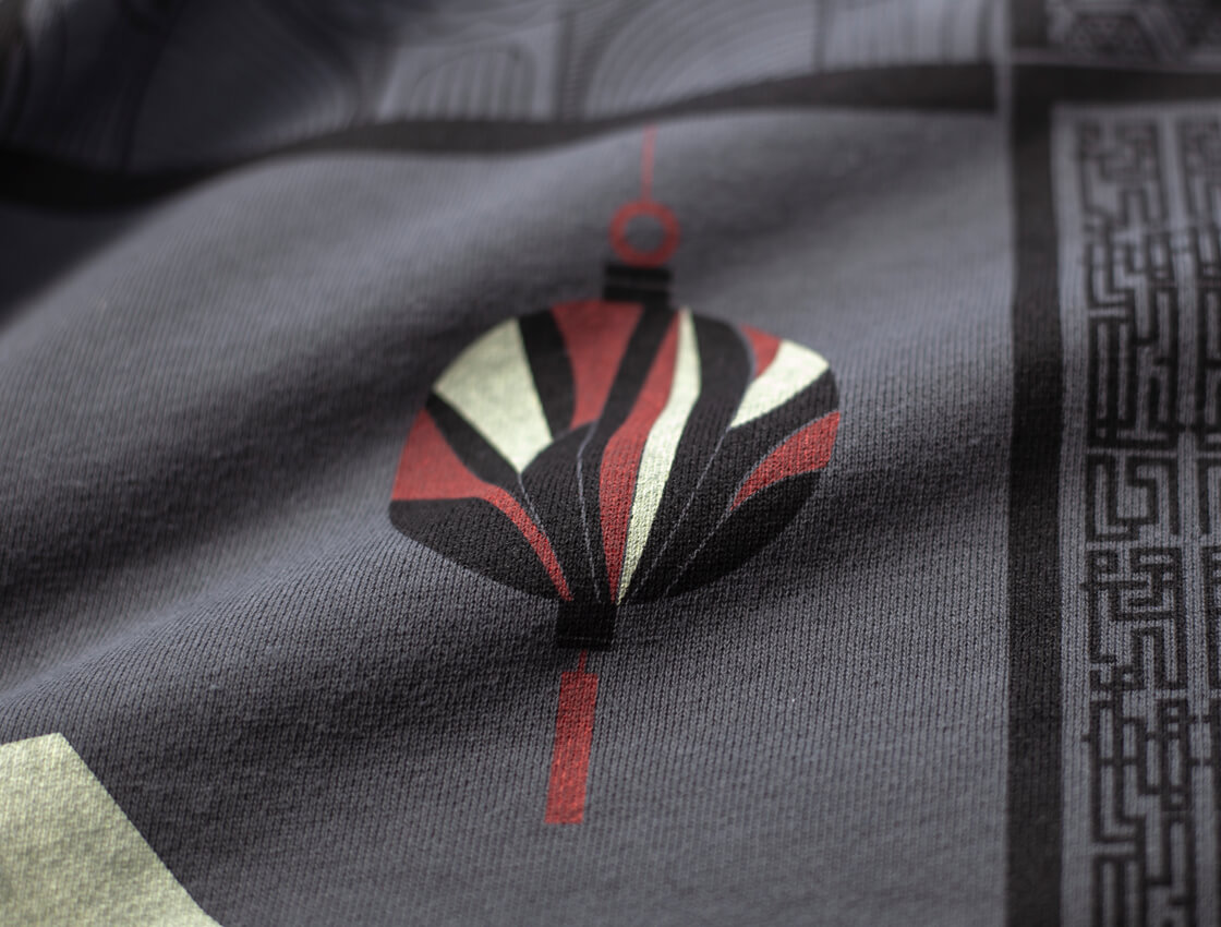 ローマ帝国時代の碑文に由来する文字に、フランスからアメリカに広がったアールデコ、中国建築の窓や欄間に用いられれる花格、日本を象徴する富士山と提灯を切り絵風に表現した、和・洋・中折衷な三位一体の文化を表現したバックプリントです。超大国による不穏なニュースが多いこの分断の時代でも、文化は交われるよという意味を込めたわけです。