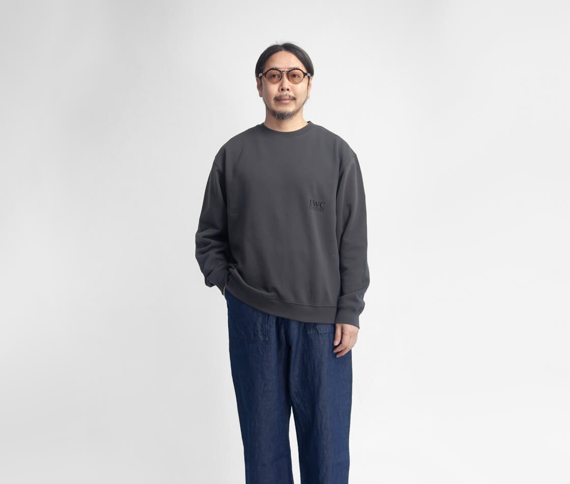 肩を少し落とし、身幅にゆとりを持たせたリラックスシルエット。袖口には5cm幅のリブを配し、きゅっと締めることで生まれる自然な袖のたまり。そのルーズなニュアンスが、絶妙なヌケ感を演出します。生地は、スウェットとしては厚すぎないウェイト。春や秋は一枚で、厚すぎないので冬はインナーとしても活躍し、ロングシーズン着られる頼もしさがあります。柔らかな風合いは、自然な落ち感があって、無理のないリラックス感を纏わせてくれます。存在感あるバックプリントはもちろん特徴ですが、ボディのちょうどいいゆとりが、良い塩梅のラフさを引き出してくれます。襟ぐりや袖・裾・アームホールはオーバーロックでつなぎ合わせた後、2本針ミシンでまたぎ縫いしてあります。2度の縫製により強度が高められていて、縫い合わせ部分もしっかりと押さえが効いています。