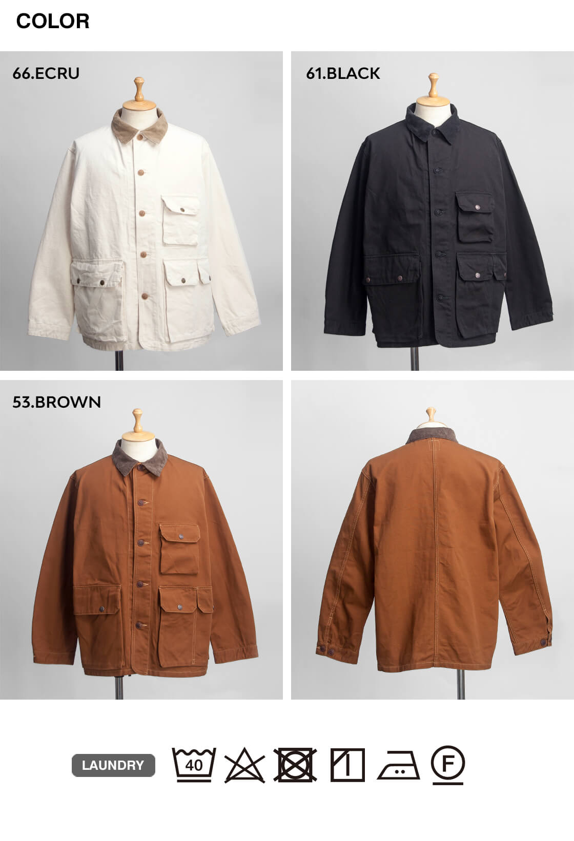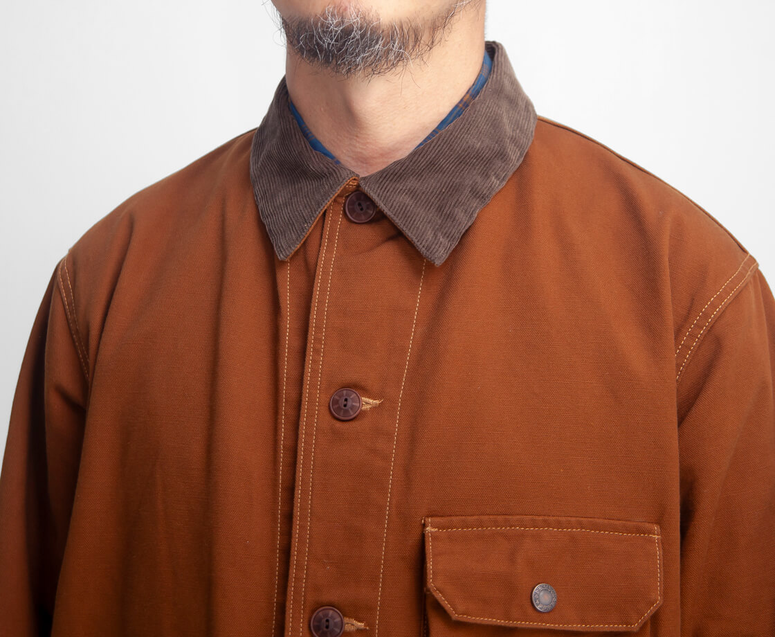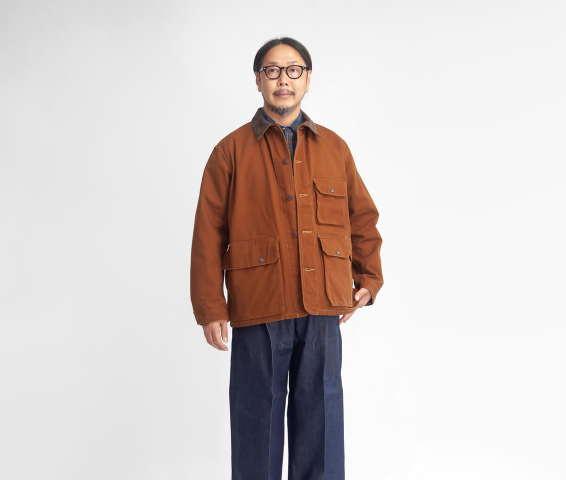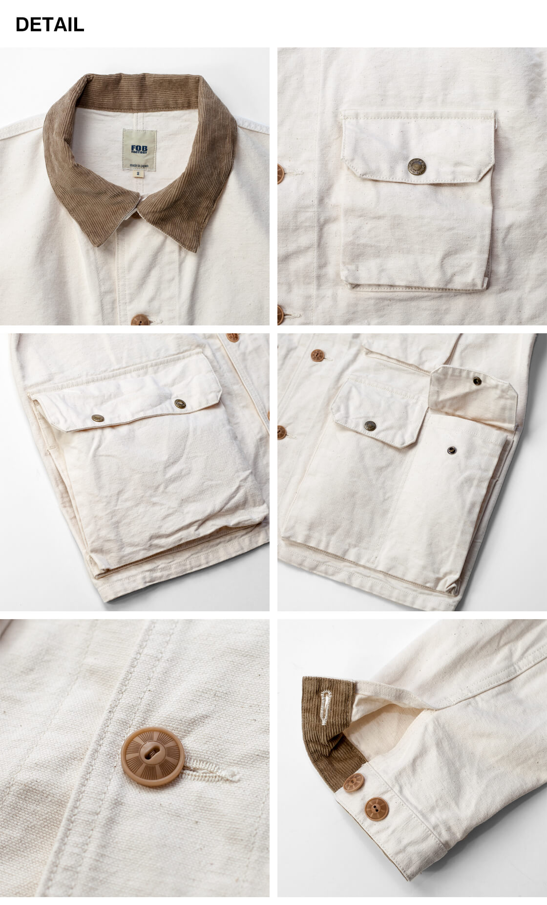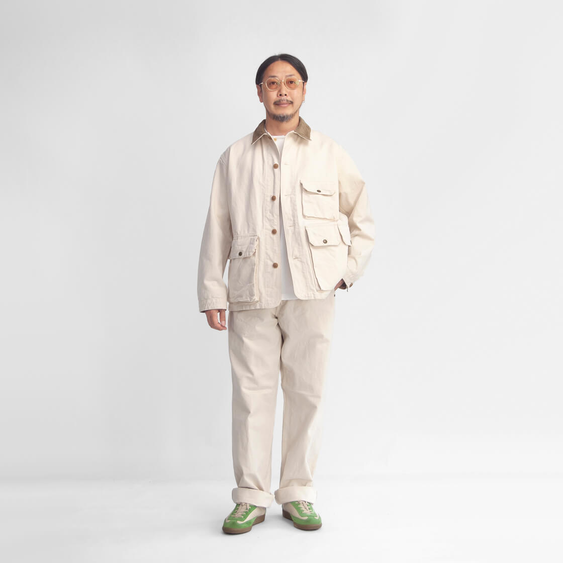 FOBオリジナルの11ozコットンダック生地を用いて製作されたハンティングジャケット「DUCK HUNTING JKT」。印象的なのはやっぱり、フロントに配置された立体的なポケット。狩猟用ジャケットの伝統を受け継いだ、マチ付きのポケットは、地図や小物もスマートに収納でき、クラシックなアウトドアスタイルの雰囲気たっぷり。首元、袖口裏には温かみのあるコーデュロイ襟をあしらい、肌触りとデザインアクセントをプラス。袖口を折り返した際にも良い塩梅のアクセントに。その袖口は2つのボタンで袖口幅の調整が可能。腰位置のポケットは横からも手を入れられる2重構造になっていて、ハンドウォーマーとしても機能します。背中心や袖・脇・アームホールなどの主要な縫製は、生地を巻き込んだ丈夫な巻き縫いでFOBならではのタフな縫製仕様。彫り加工入りのナットボタンや月桂樹スナップボタンなどの付属使いもクラシックな雰囲気を盛り上げる要因に。ちなみに同素材のワークパンツと合わせることで、まとまりのあるセットアップスタイルも完成します。