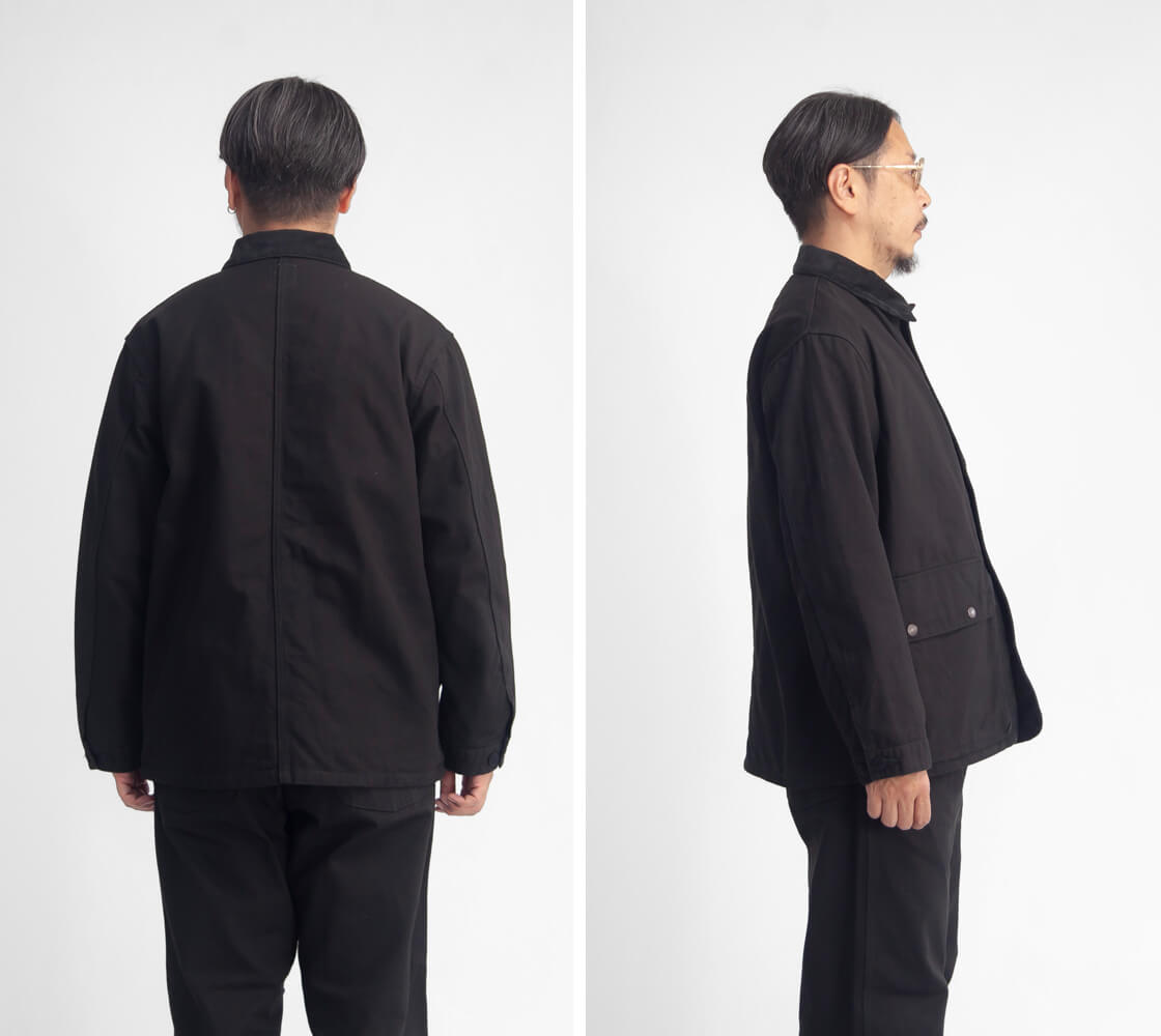 本体に用いているのは、FOBがオリジナルで製作した11オンスコットンダック生地。11オンスなので厚みはそこまで極厚ではありませんが、ザラ感のあるタッチ・しっかりとした硬めの生地感はとってもタフ。太めの綿糸を密に織り込んだワークウェア定番の生地で、高い耐久性と難燃性は数多くある天然素材の生地の中でも随一。色落ちやアタリなどの経年変化も独特で、クタクタになるまで着用頂きたい素材です。
