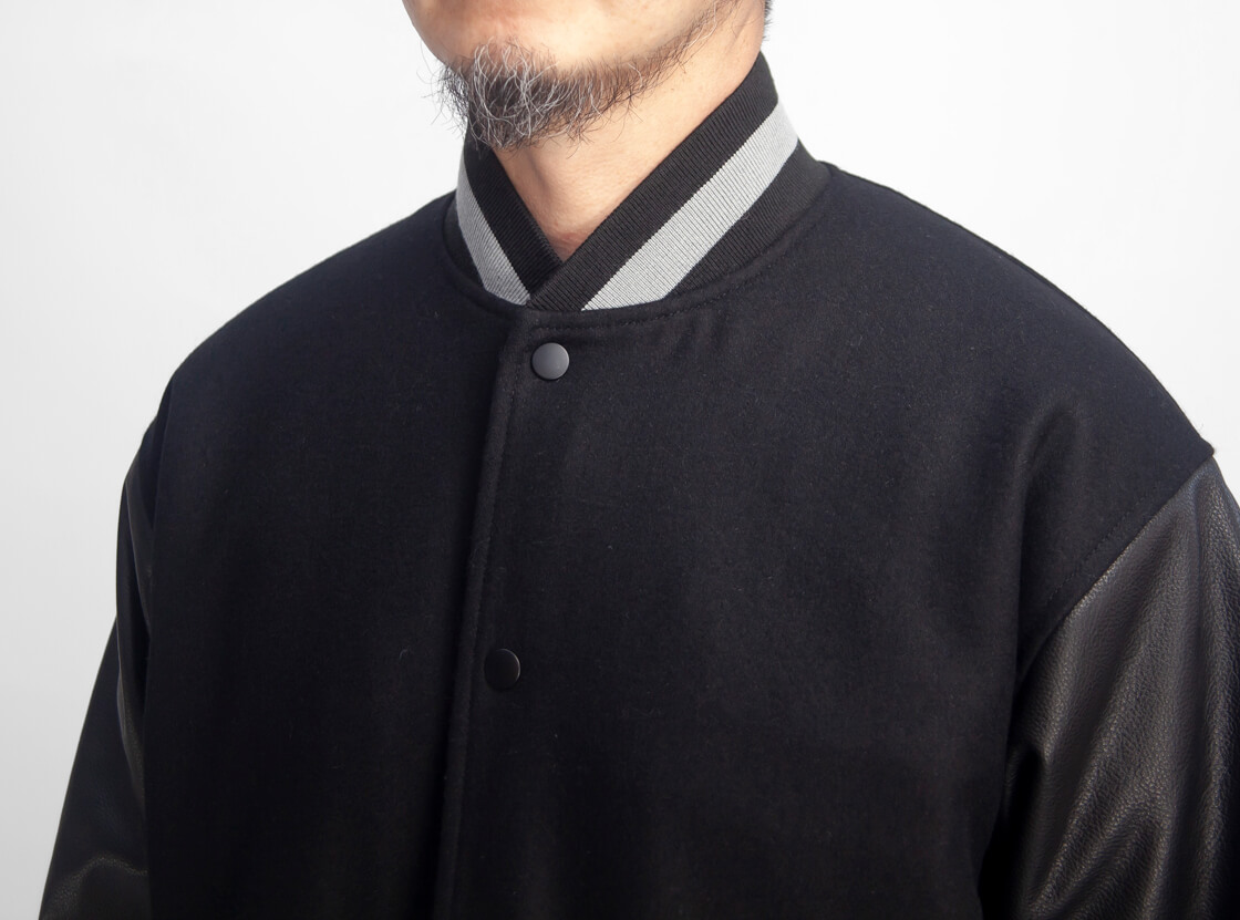 スタジャンの元祖と言えるBUTWINに別注した、ブラック色のウールメルトン×レザーのシックな組み合わせにラインを効かせた当店限定のアワードジャケット。