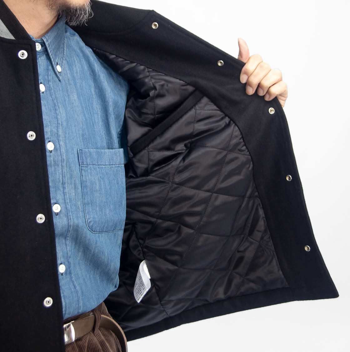 シックな佇まいが際立つ、ブラック×ブラックの別注アワードジャケット。よくあるオールブラックのスタジャンよりも無骨になりすぎず、かといってスポーティすぎない、もちろん大人が着たい、そんな一着に仕上がりました。
