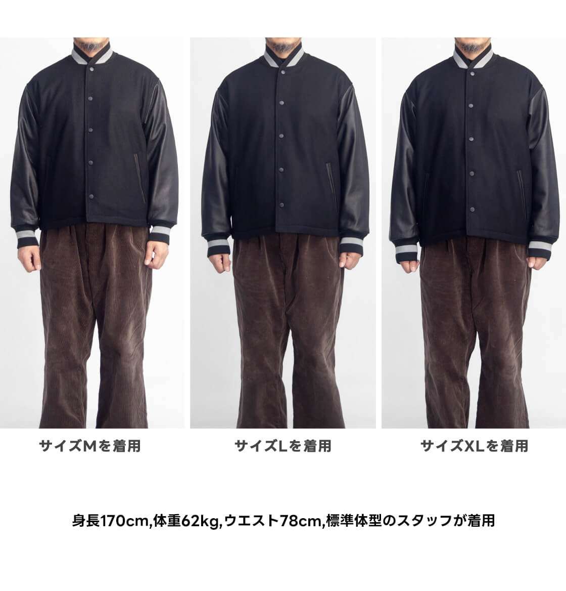 Lサイズを着用しました。身幅や肩幅、アームホールに余裕があり、ゆったり目なシルエットで着こなせます。メルトン・レザー・中綿のスタジャンとしては比較的着心地も軽いです。Lサイズだと袖丈は少しだけ長めさですが、気になるほどではありません。正直Mサイズでも、身幅はゆったりと着用できますので、僕くらいの身長の方であればMサイズで良いかと思います。個人的にオーバー目に着用したいのでLを着用しています。