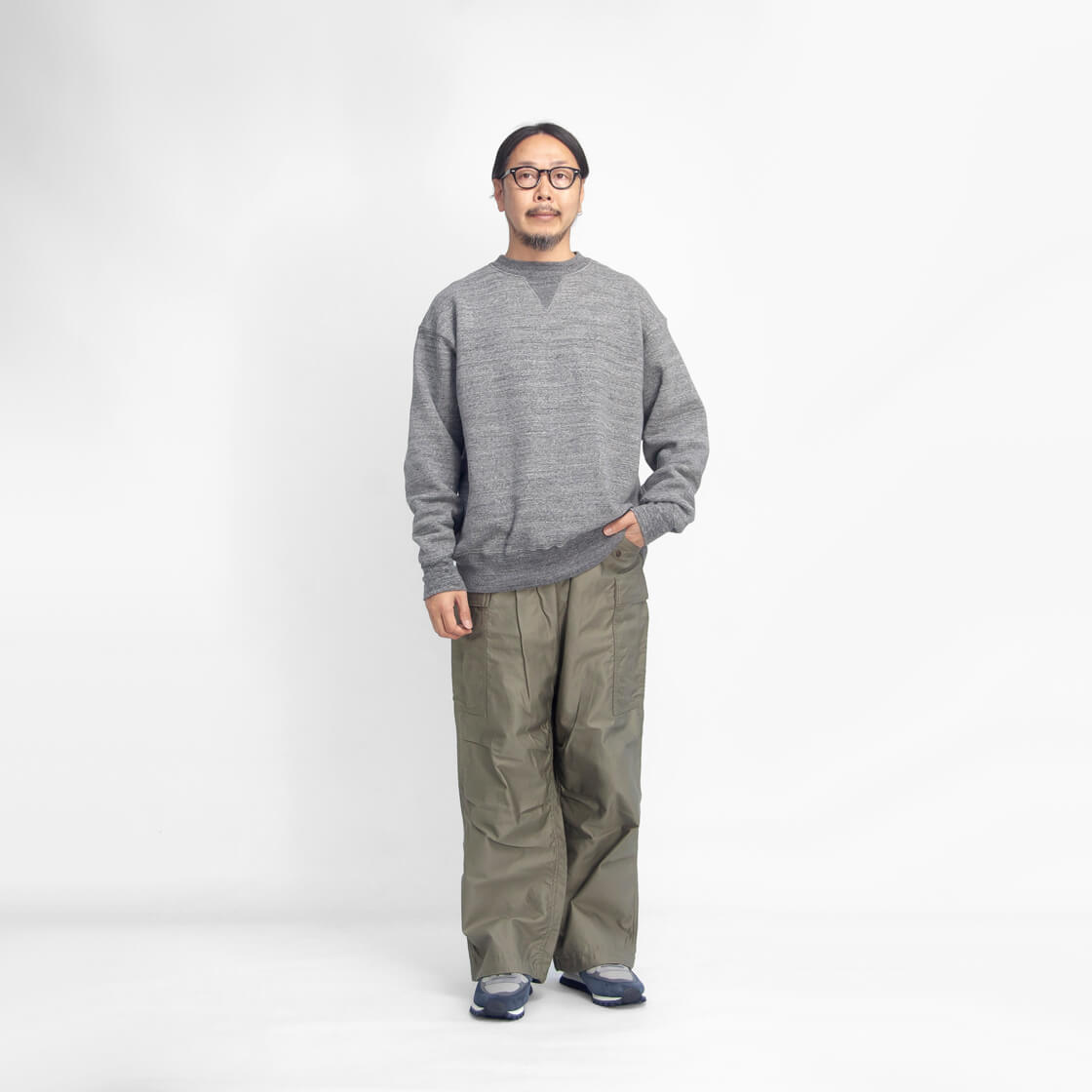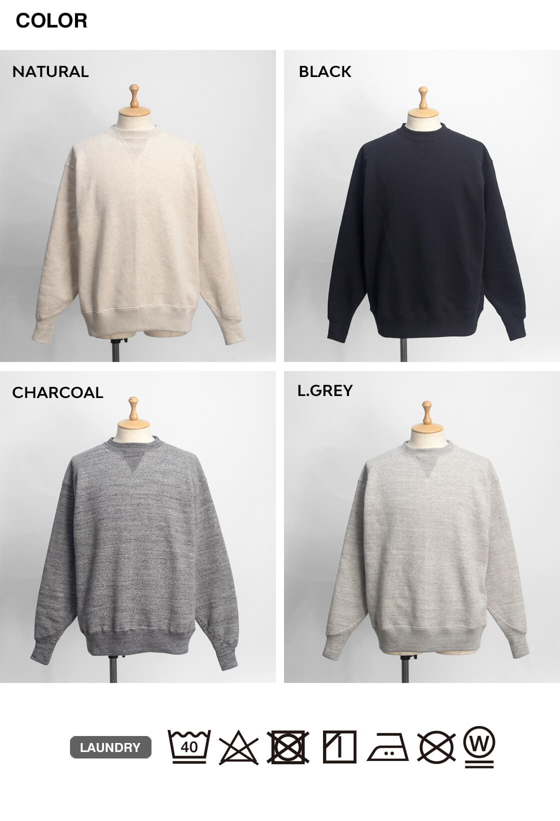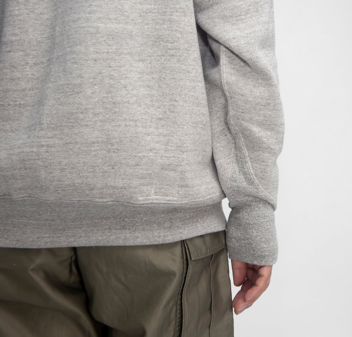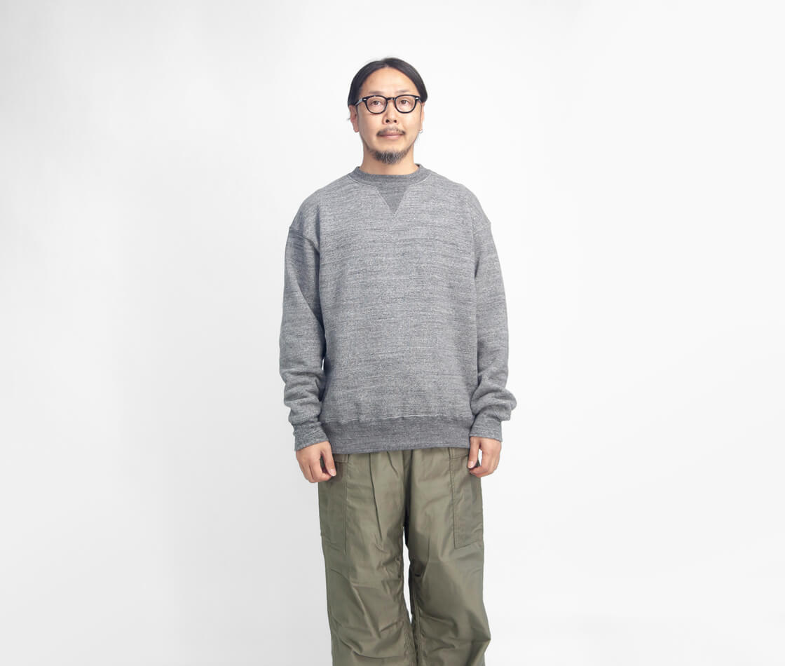 1930年代にウールコットンブレンドで作られていたスウェットを、コットン裏起毛で現代的に蘇らせたのがこのモデル。首元のV字ガゼットは、1930年代まで見かけられたヴィンテージスウェットお馴染みの後ろ襟にも付いた両V仕様。内側がV字にカッティングされた袖口の長リブなど当時のディティールをそのままに再現。筒状に編みたてられたスウェット生地をそのまま活かした丸胴のため、身頃脇には縫い目がありません。縫い目のゴロツキがなく着心地も優しい。さらに袖、裾のリブに関しても同様に無縫製の筒リブになっており、作り手のこだわりが感じられます。現代のスタイルでの着用を前提としたゆったりとした身幅、シルエット。復刻と言えどもスタイリング頂きやすくサイズ感が設定されています。