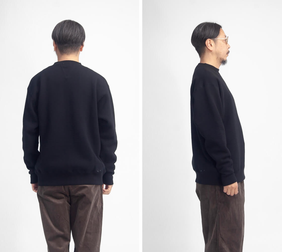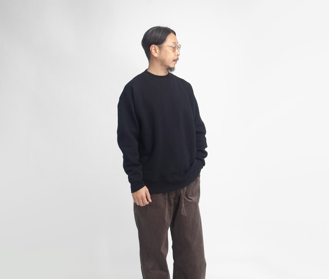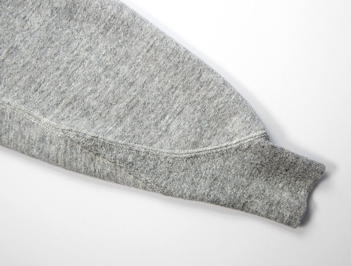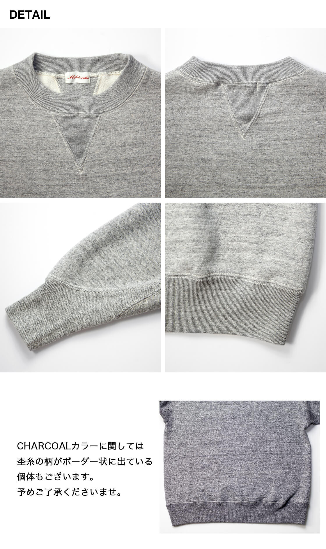1930年代にウールコットンブレンドで作られていたスウェットを、コットン裏起毛で現代的に蘇らせたのがこのモデル。首元のV字ガゼットは、1930年代まで見かけられたヴィンテージスウェットお馴染みの後ろ襟にも付いた両V仕様。内側がV字にカッティングされた袖口の長リブなど当時のディティールをそのままに再現。筒状に編みたてられたスウェット生地をそのまま活かした丸胴のため、身頃脇には縫い目がありません。縫い目のゴロツキがなく着心地も優しい。さらに袖、裾のリブに関しても同様に無縫製の筒リブになっており、作り手のこだわりが感じられます。現代のスタイルでの着用を前提としたゆったりとした身幅、シルエット。復刻と言えどもスタイリング頂きやすくサイズ感が設定されています。