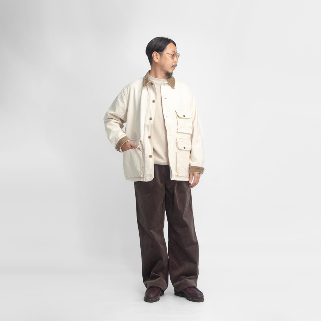 38サイズを着用しました。身幅はゆったりとした印象で今らしいスタイリングに合うサイズ感で、肩が大きく落ちます。着丈は長すぎずスッキリとした印象です。40サイズになると全体的に大きくなりすぎますし、38サイズでも十分にゆとりを感じるので特にサイズアップの必要はありません。
