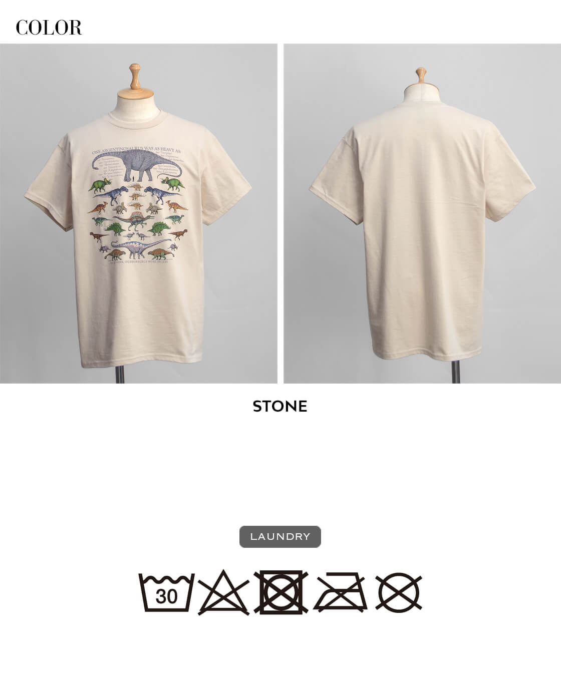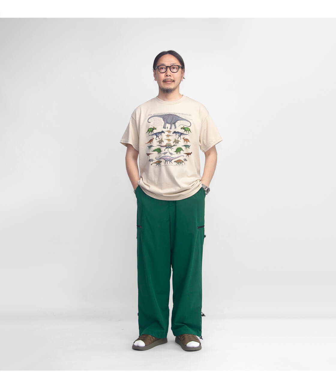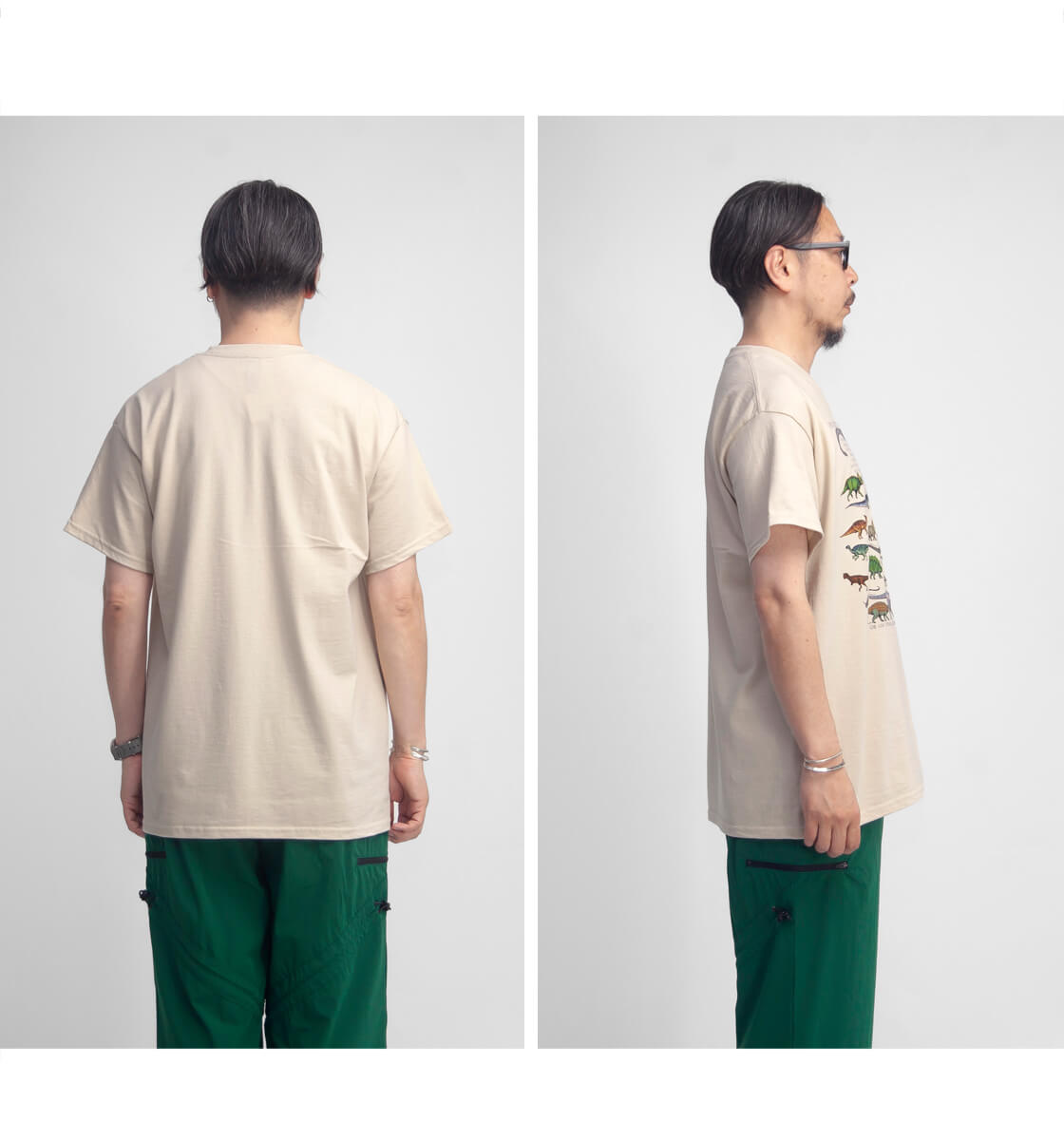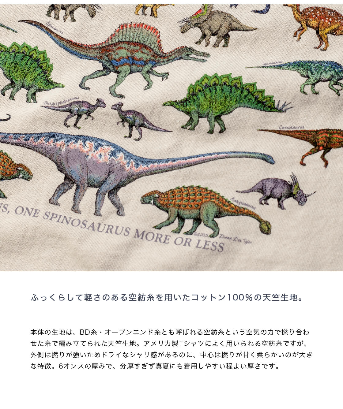 図版の様な緻密な恐竜のプリントTシャツですが、プリントに用いているのは水以外の有害な溶剤を使用しないPVCフリーの水性インクを使用していたり、プリントの際に使用した水も、ろ過することで環境への負担を最小限にしているという、環境面を考慮したサステナブルな側面も持つブランドでもあります。
