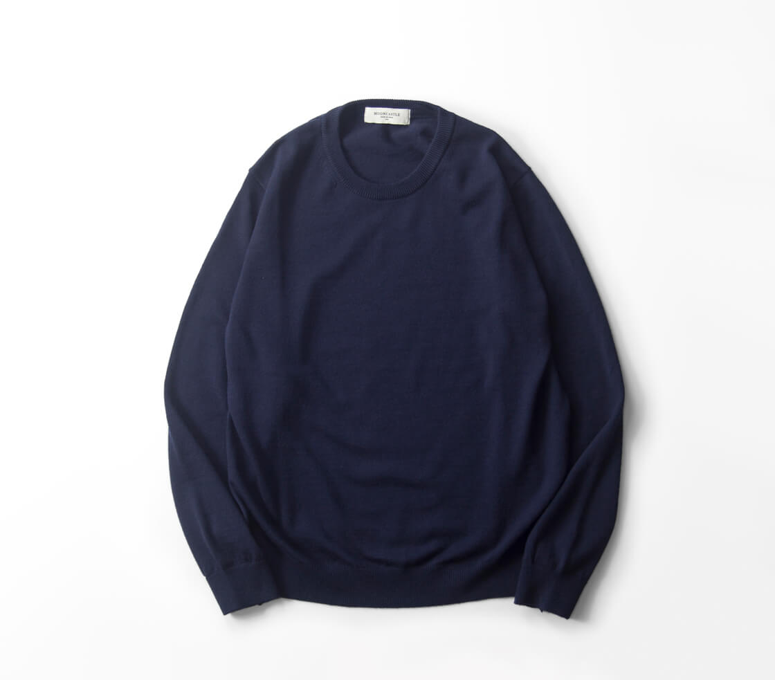 MOONCASTLE冬の定番、12ゲージの高級ウールの代名詞「エクストラファインメリノウール」を贅沢に使用したクルーネックニット。ビジネスシーンに使えるようにと商品企画されてだけあって、目の細かい上品な編みたてでジャケットに合わせやすい。モチロン、カジュアルなビジネスシーンだけでなく、1枚で着こなしたい休日にも。