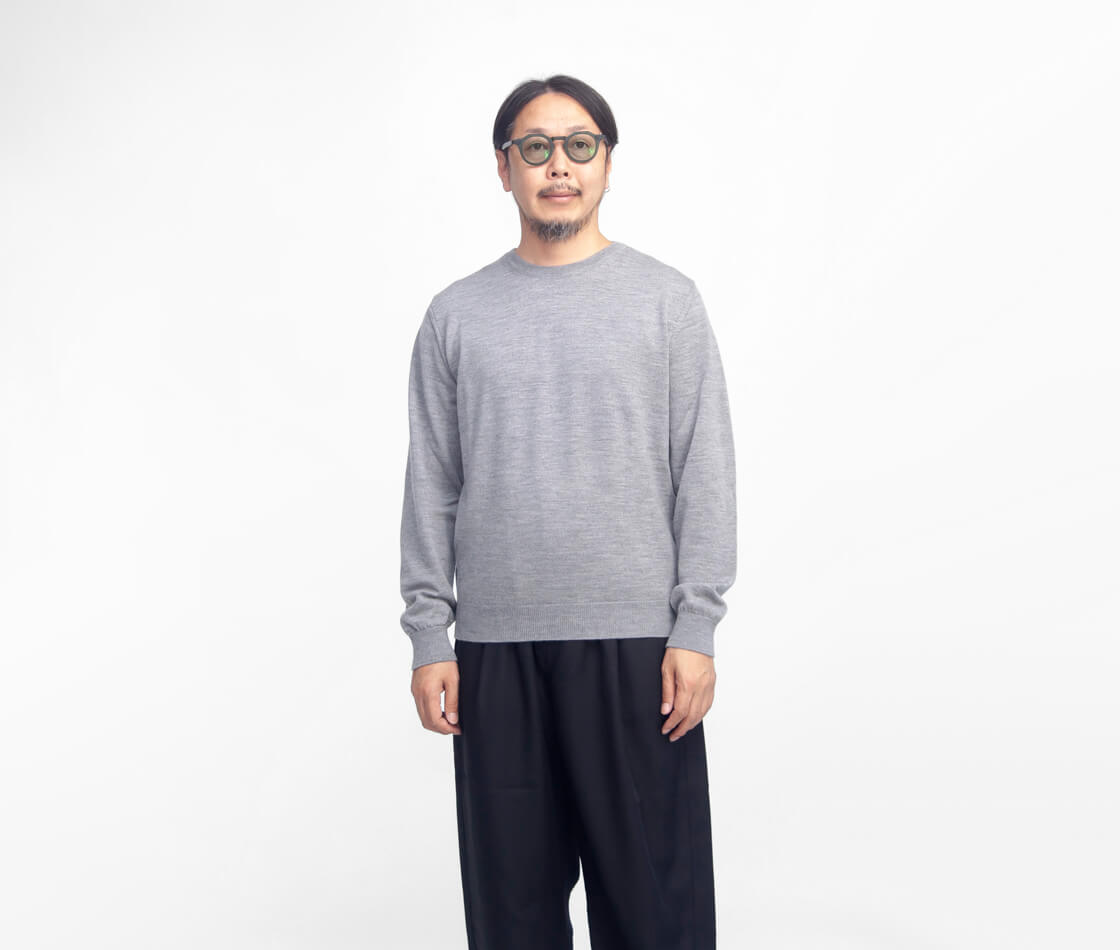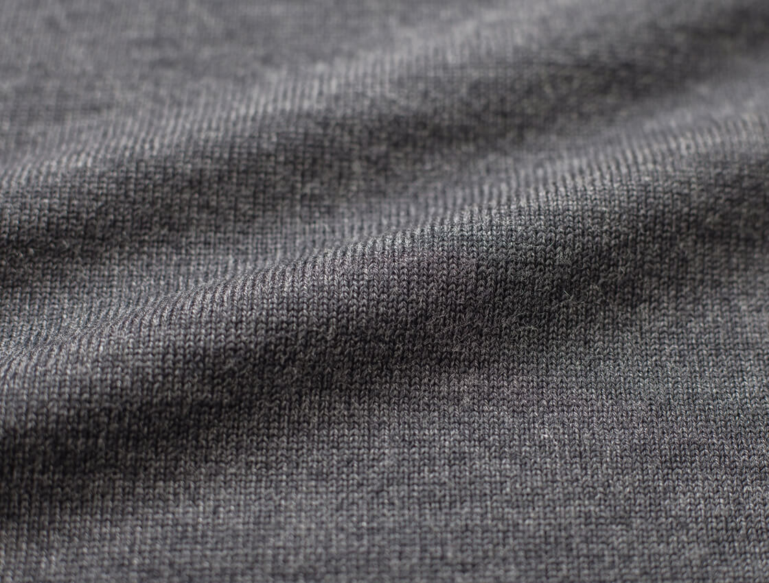 世界一の羊毛生産国として知られるオーストラリア産の、高級ウールの代名詞エクストラファインメリノウールを100%使用し、天竺編みで編み立てた生地は光沢があり、しなやかで滑らかな手触りでどこまでも上品な生地感。エクストラファインメリノは、メリノ種の羊からとれるウールの中でも最高品種のウール。光沢があり柔らかく、繊維が細くしっとりとした極上の肌触りが特徴です。一般的に糸は細ければ細いほど高級になりますが、こちらで用いている糸の細さは19.5ミクロンという細さ。単位で表現してもわかりにくいと思いますが、繊維の宝石とも呼ばれるカシミヤに近い細さなのです。ウール特有のチクチク感は、繊維が太いため起こりますが、繊維が細いとチクチク感は軽減されます。個人差はありますが、素肌に着ても心地の良い着心地を体感頂けるかと思います。またこちらのニットは防縮加工を施した糸を用いており、さらに生地にした段階でも洗いをかけ縮みを出していますので、ご家庭での洗濯機の使用も可能に。また防縮加工糸は固くなりますが、ウール本来の柔らかさを損なわないよう柔らかい風合いのまま加工されております。12ゲージの細ゲージの天竺で編みたてられたニットは、とにかく上品で光沢が出て、高級エクストラファインメリノにはうってつけの編み立てかと思います。