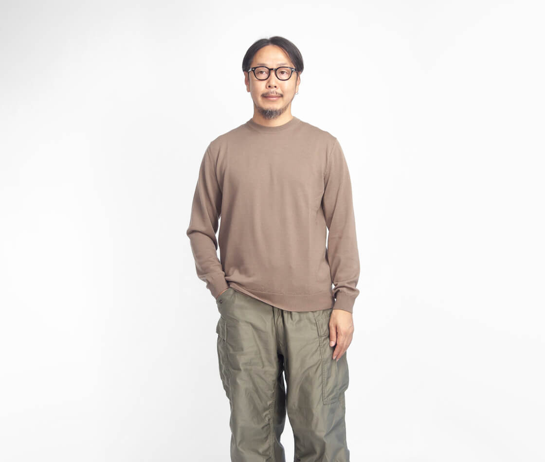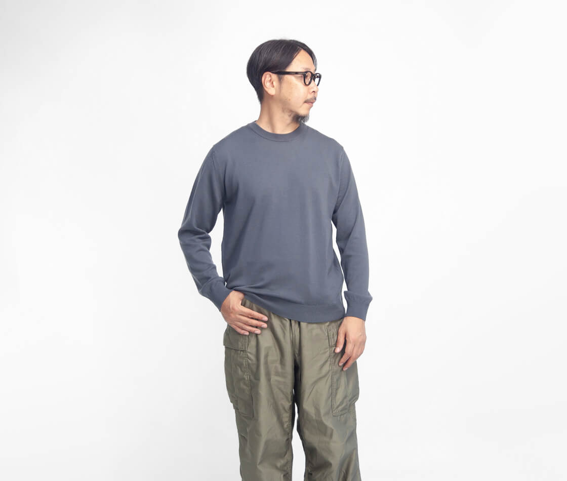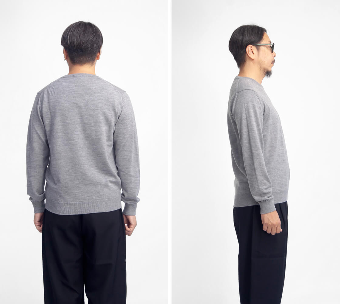 サイズ感は細すぎずゆったりしすぎないレギュラーなフィット感。リブで程よく締めた袖口は、ジャケットを着用しても袖口が中に折れにくいのが特徴。裾も同様にリブ入りで、タックインしなくても腰にフィットし、だらしなく見えません。やや細めで狭めのリブ間隔の襟ぐりは上品な印象。イマのカジュアルな雰囲気でゆったりと着用したい場合は、ワンサイズ、ツーサイズ上げて着用するのもアリ。