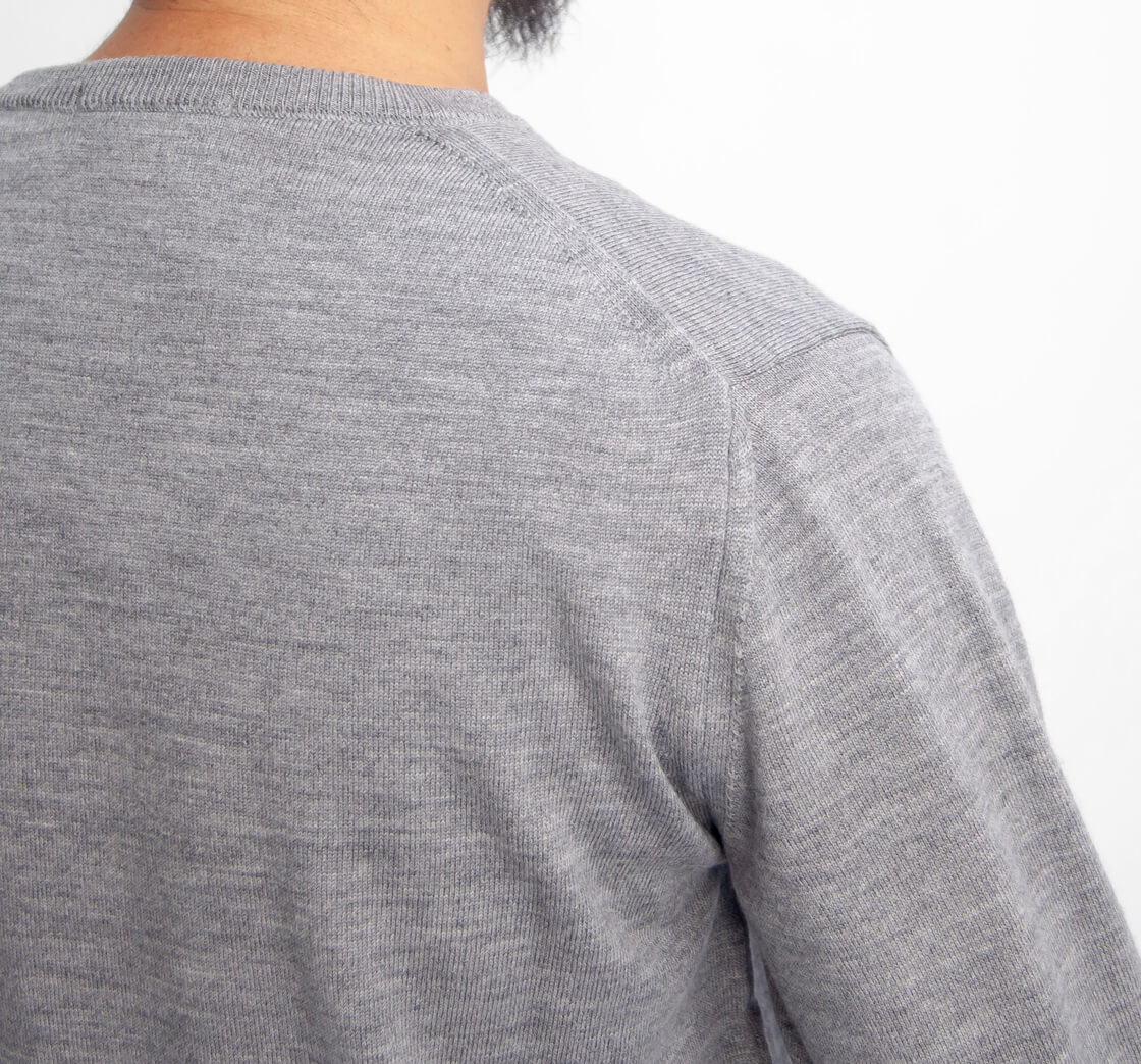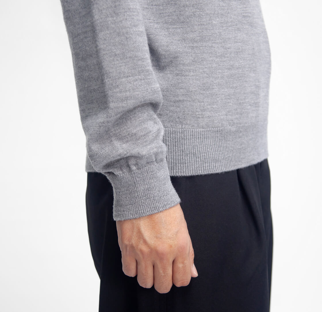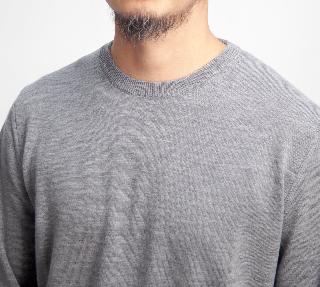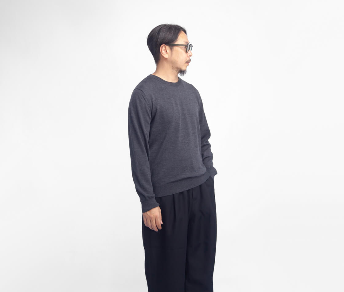 高級ウールの代名詞「エクストラファインメリノウール」を12ゲージの細めのゲージで編み立てたどこまでも上品なニット。防縮加工を施し、洗濯機での洗濯も可能なデイリーニット。