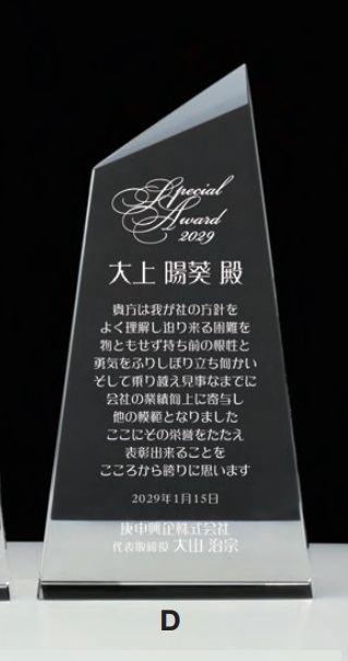 優秀社員賞、優良社員賞、社長賞などの企業表彰や、感謝状、功労賞、表彰状、退職記念などの記念品としてご利用いただけます。