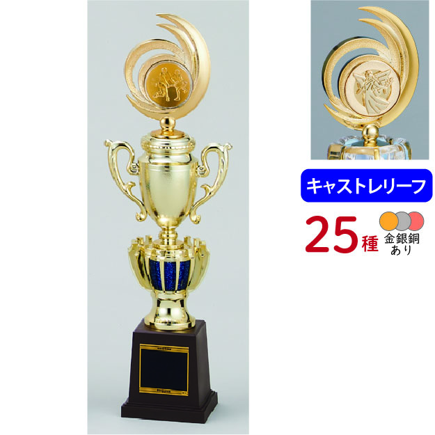 各種スポーツ大会など表彰式で使われる、上部にレリーフがついたトロフィーです。