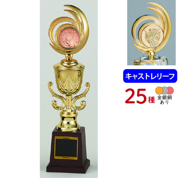 各種スポーツ大会など表彰式で使われる、上部にレリーフがついたトロフィーです。