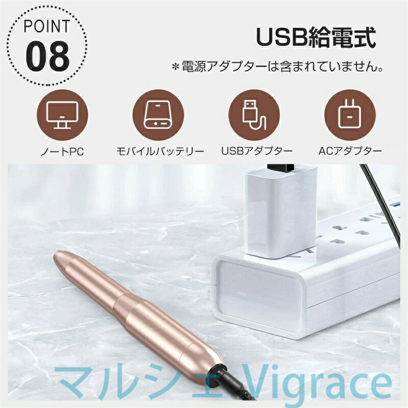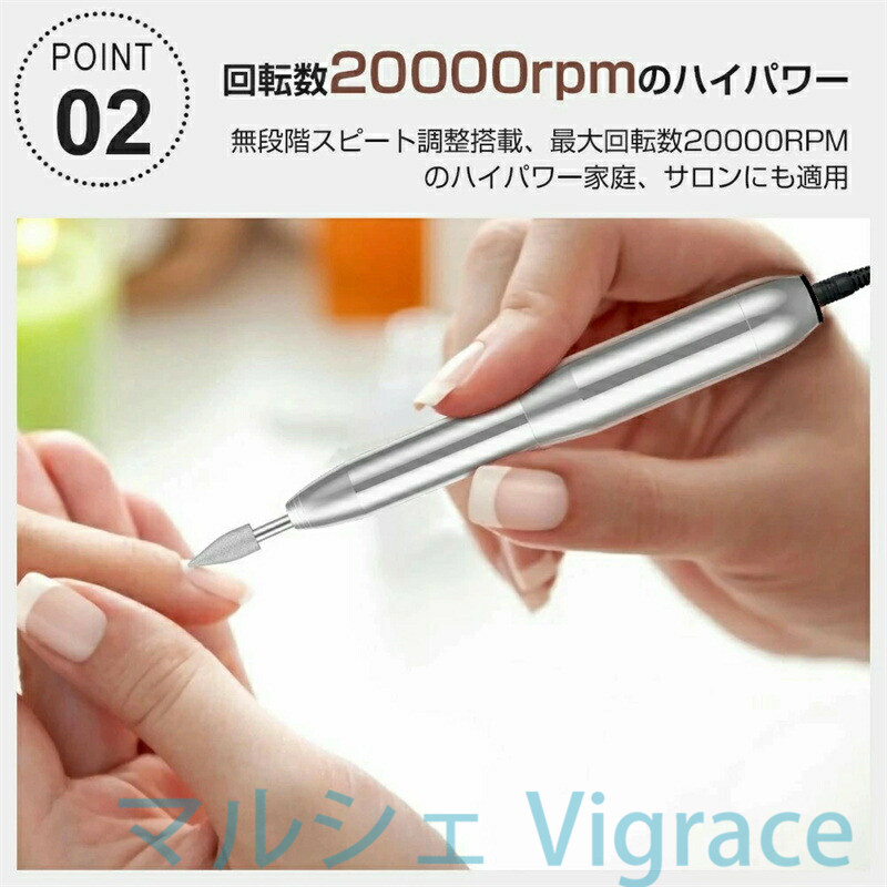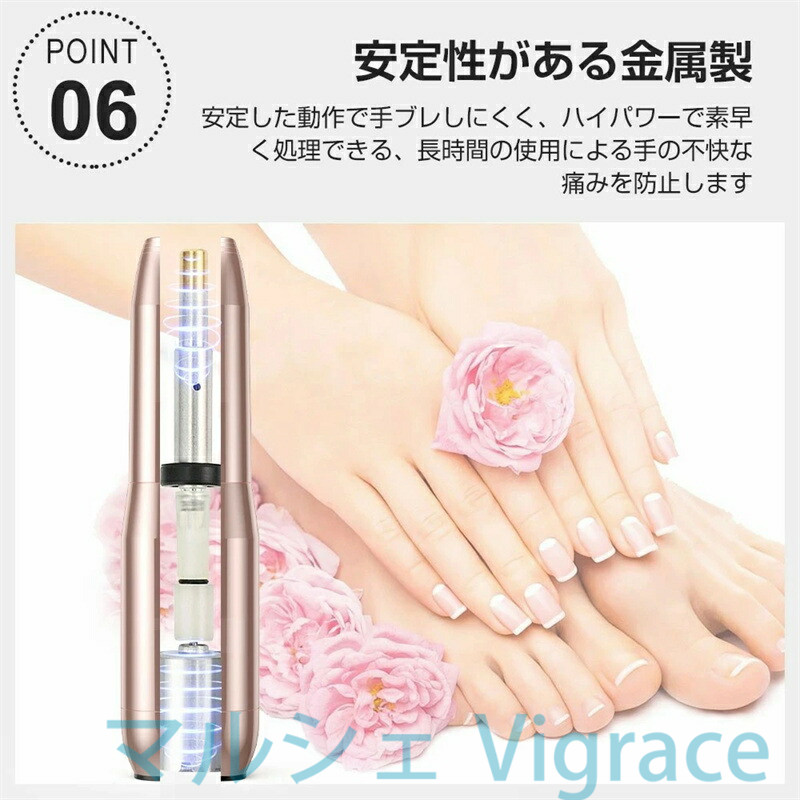 無段階変速&正・逆回転 人間工学に基づいたデザインで手にぴったりとフィットし、簡単に快適な体験をお楽しみいただけます。強力的なモーターで他人の邪魔にならないようにデザインしたので音はほぼ無し、または本体はアルミニウム製なので、ネイルケア中にもしネイルマシーンが熱くなってもすぐに熱を逃すから、本体が熱すぎることを防ぎます。