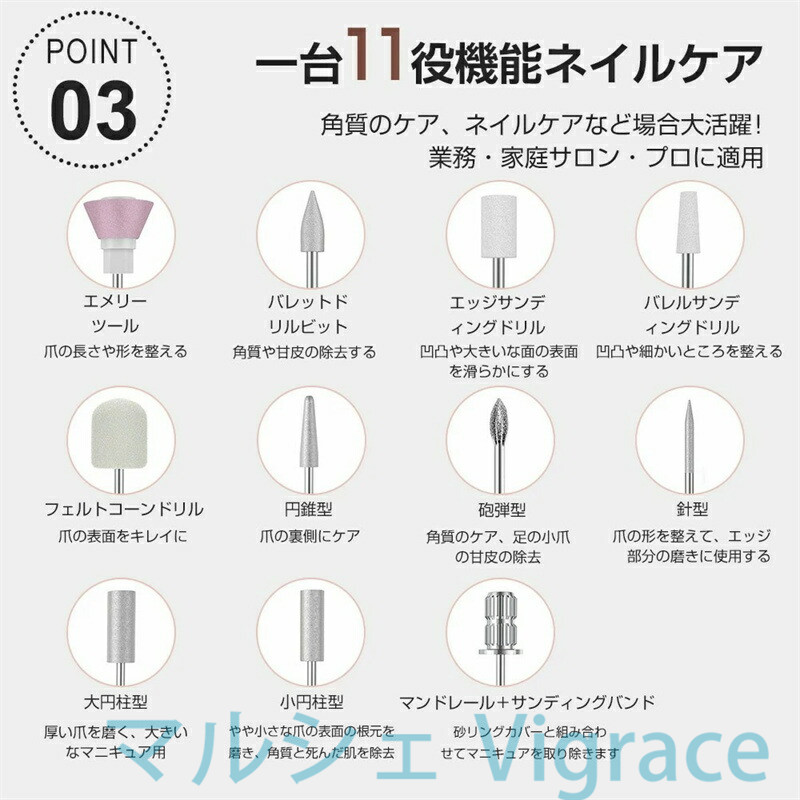 商品詳細1台11役! アタッチメントを変えて磨くだけで爪がピカピカに! コンパクトなのUSB給電式タイプで、爪の整形、ジェルオフ、甘皮処理角質の除去、表面慣らしから、磨きまで11種類のアタッチメントを変えるだけでカンタンにネイルをケアできます。ネイルサロンと自宅が愛用することの多いです。
